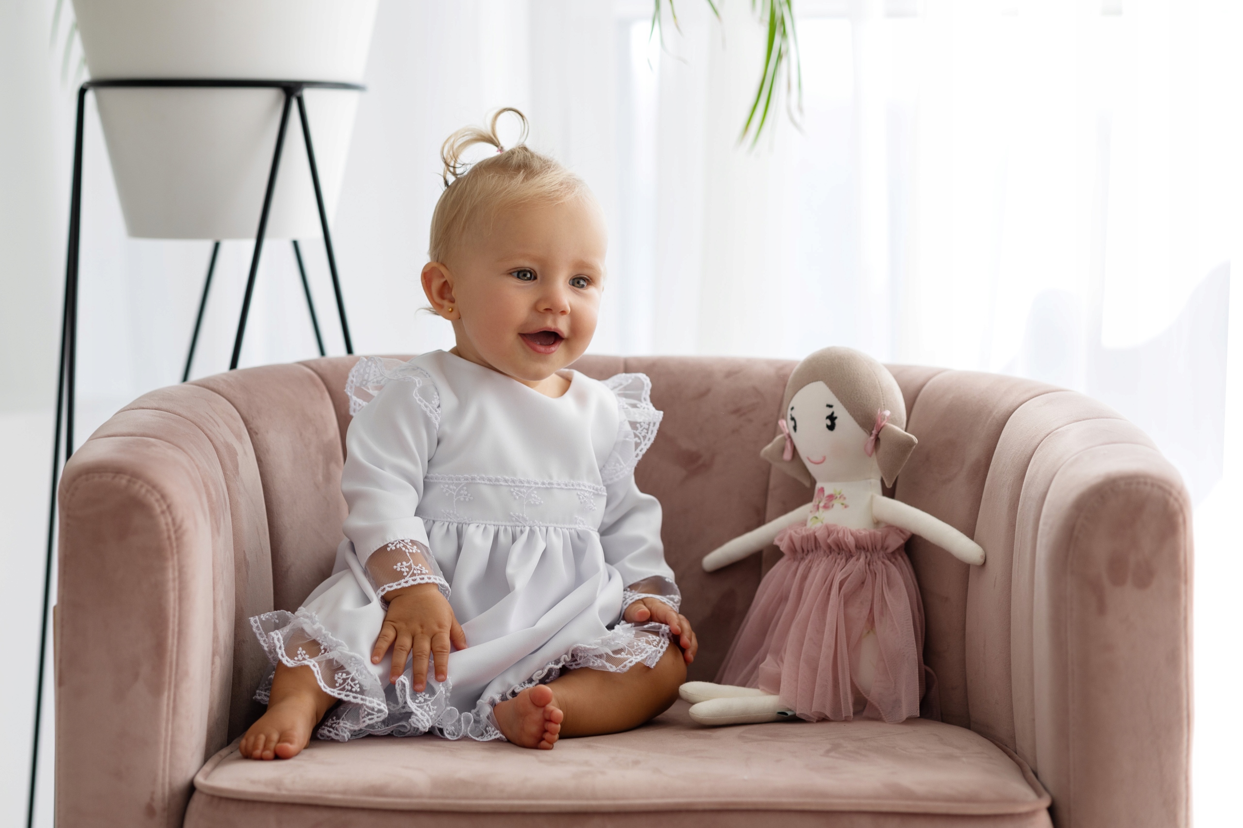 Крестильное платье цвета экрю для девочки Надя – скромное и очень девичье платье, в котором ваша маленькая дочка будет радовать своим очарованием. Выполненное из ткани нежного экрю/кремового оттенка, оно гармонирует с украшающим его кружевом. Платье украшает нежная рюша, отделка рукавов, бабочки на плечах и декоративный пояс на линии талии. Крестильное платье с длинными рукавами застегивается на три удобные кнопки сзади.
