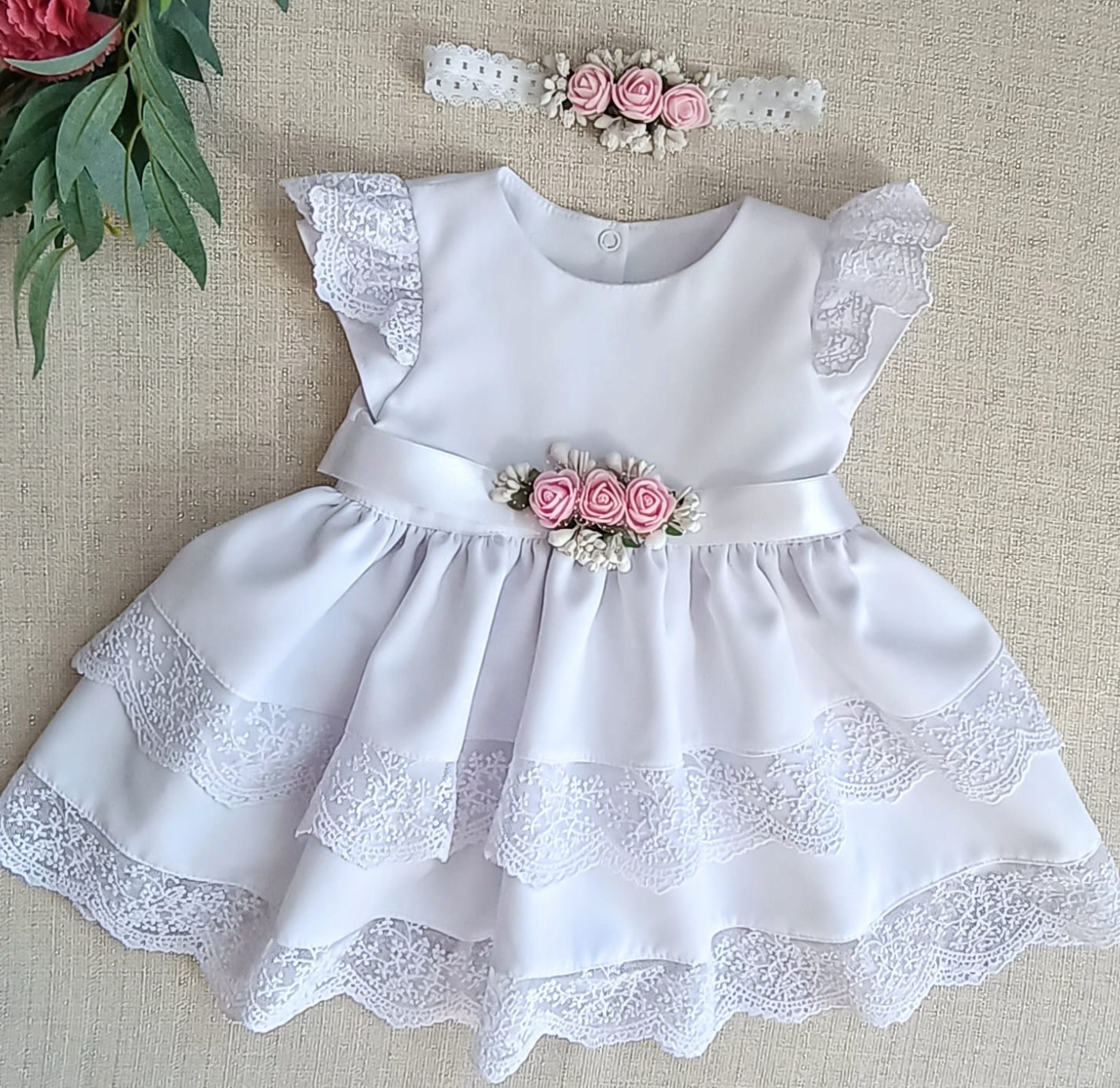 Белое крестильное платье Камила 2 – красивая крестильная укладка для Маленькой леди, выполненная из эффектной плательной ткани. Крестильное платье с короткими рукавами украшено кружевными бабочками, а низ выполнен из двух рюшей, также отделанных таким же нежным кружевом с растительным мотивом. Сзади крестильное платье Камила застегивается на 3 кнопки, а верх платья пришивается на хлопковой подкладке методом потайных швов, чтобы швы не мешали ребенку при ношении платья.