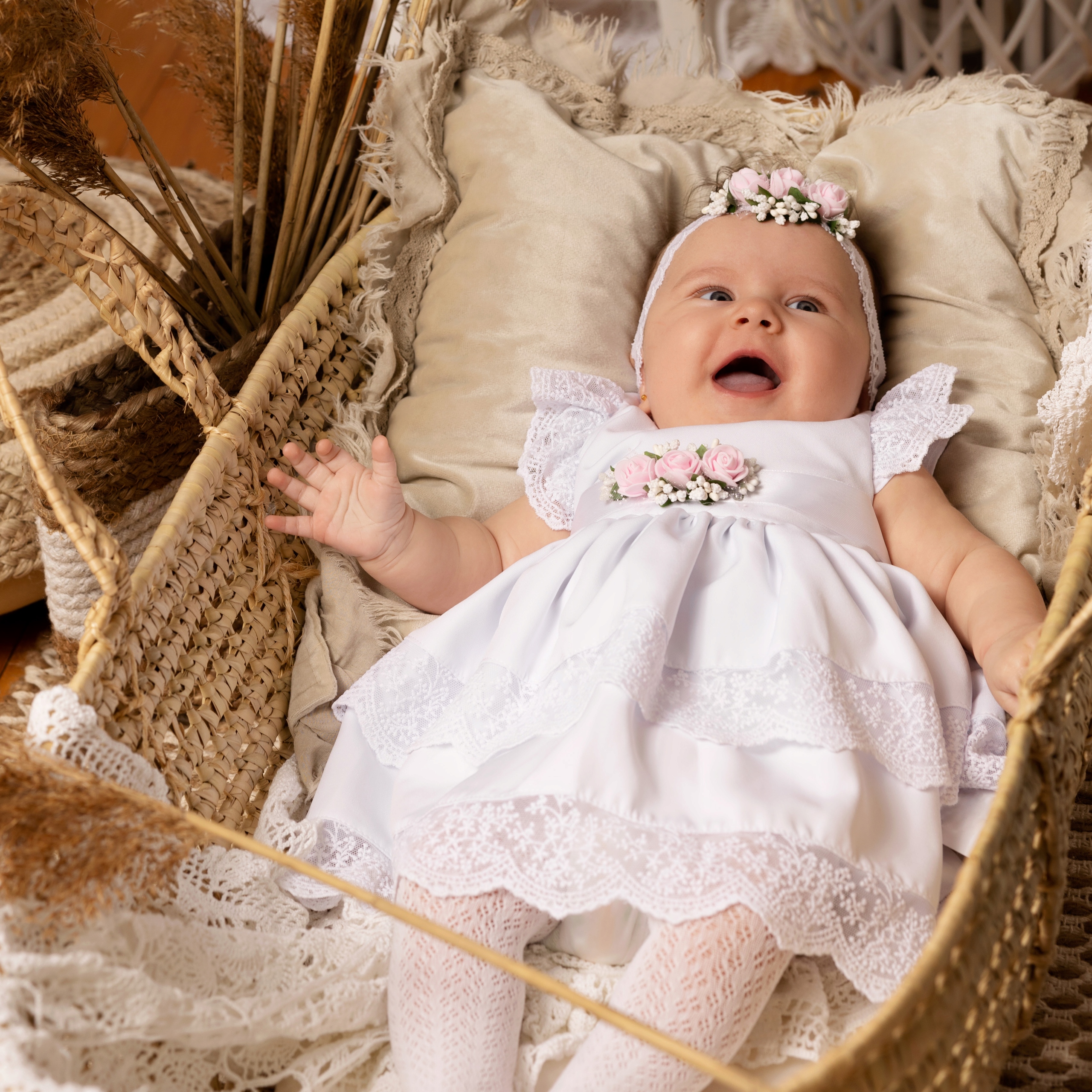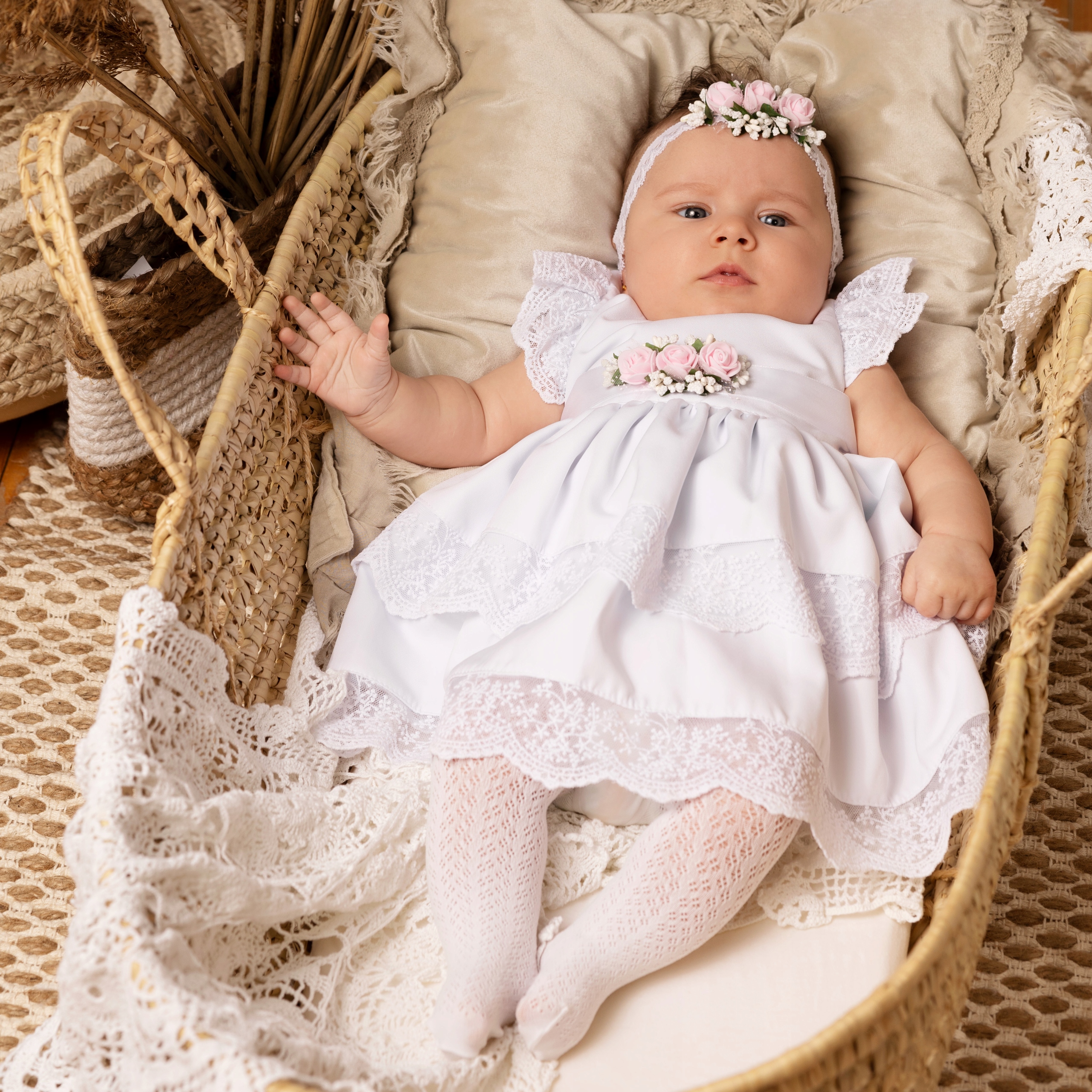 Белое крестильное платье Камила 2 — красивая крестильная укладка для Маленькой леди, выполненная из эффектной плательной ткани. Крестильное платье с короткими рукавами украшено кружевными бабочками, а низ выполнен из двух рюшей, также отделанных таким же нежным кружевом с растительным мотивом. Сзади крестильное платье Камила застегивается на 3 кнопки, а верх платья пришивается на хлопковой подкладке методом потайных швов, чтобы швы не мешали ребенку при ношении платья.