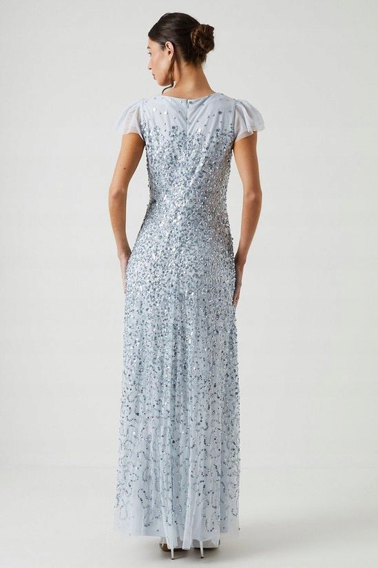 Blue Sequin Maxi Tule Plore, идеально подходит для особых случаев. Он имеет круглый вырез и короткие рукава, что делает его удобным и эффективным. Прекрасно подчеркивает фигуру, а украшения для блеска добавляют блеск и элегантность.