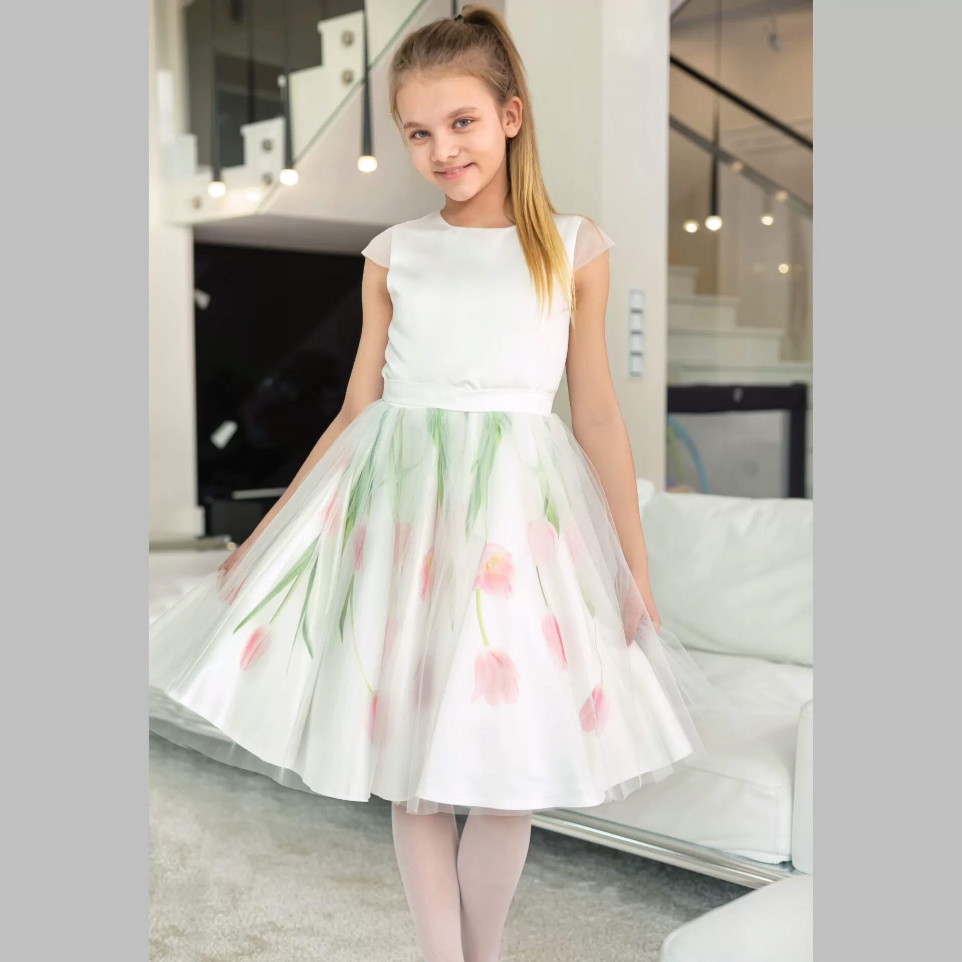 Тюльпов платье для девушки - уникальный выбор для любого элегантного случая. Платье тюльпана для девушки в оттенке экру отличается юбкой, украшенной очаровательным рисунком красивых тюльпанов, которая была покрыта нежным тюлем. Все платье для девушки с цветами основано на удобной хлопковой подкладке, которая обеспечивает мягкость и комфорт в течение дня. Юбка сшита со всего круга, добавляет легкость и элегантность к платью, а в талии есть ремешок с экру, закончившийся сзади с луком, который подчеркивает тонкий стиль. Платье закреплено покрытым замком, который обеспечивает идеальную посадку и аккуратную отделку. Это цветочное платье для девушки станет отличным выбором для свадьбы или других специальных мероприятий, сочетающих элегантность с Грейс.