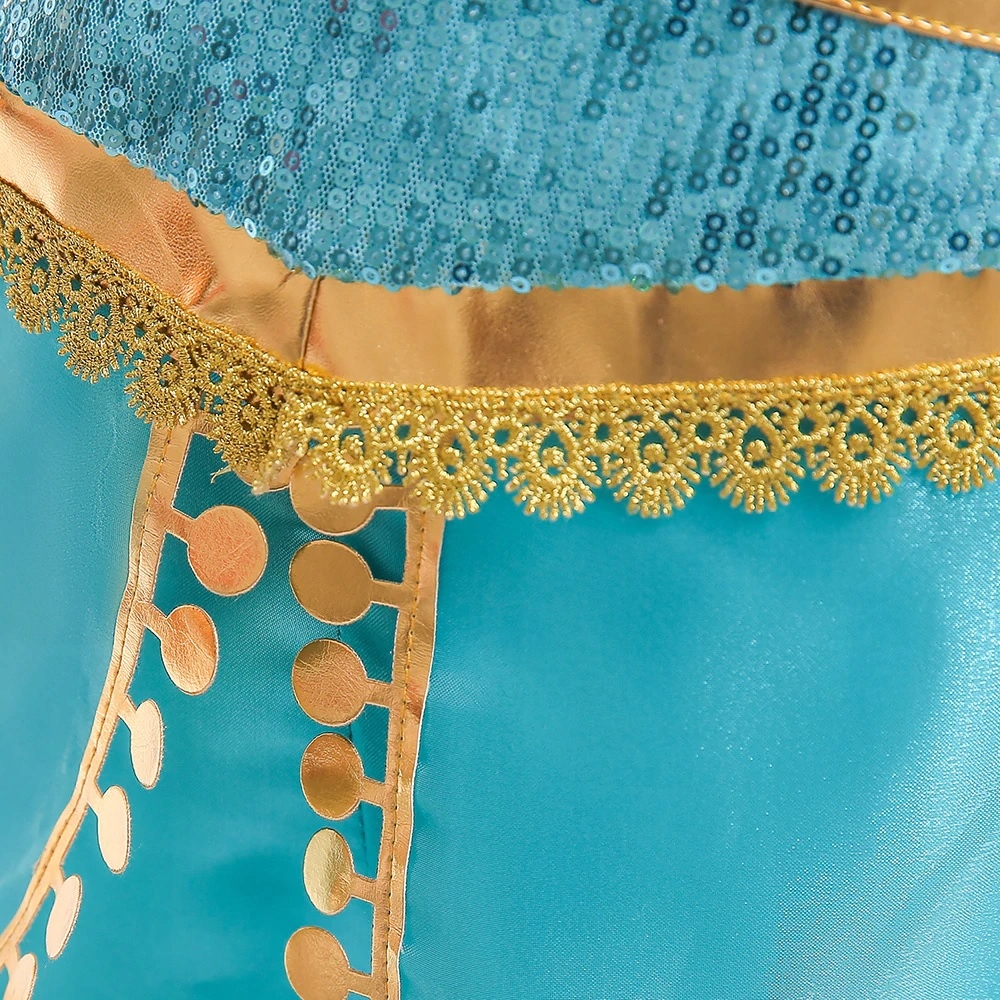 Идеальный костюм для маленьких девочек, особенно для поклонниц сказки Аладдин хорошо выполнен в синих тонах с золотыми элементами. Дети смогут почувствовать себя любимым персонажем, надев костюм сказочной героини. Костюм гарантирует фантастическое развлечение, развивающее воображение ребенка.