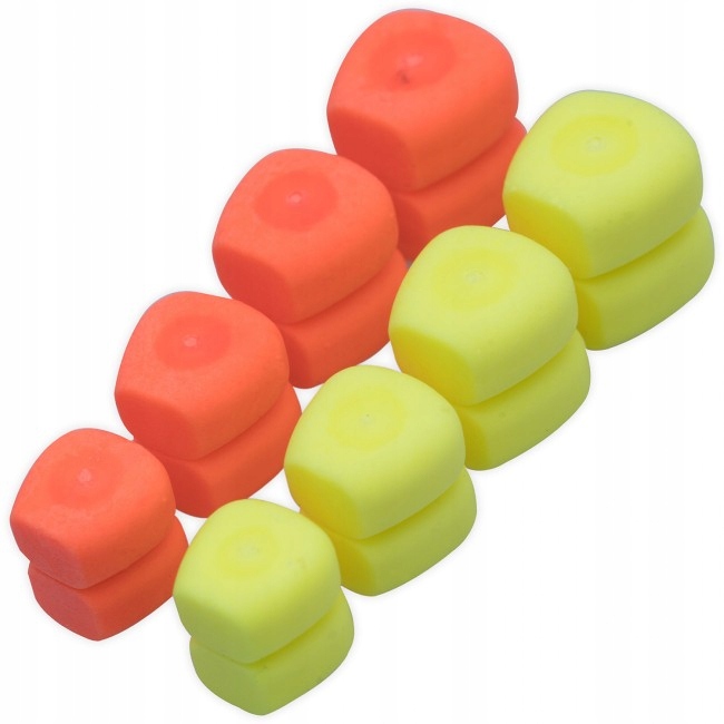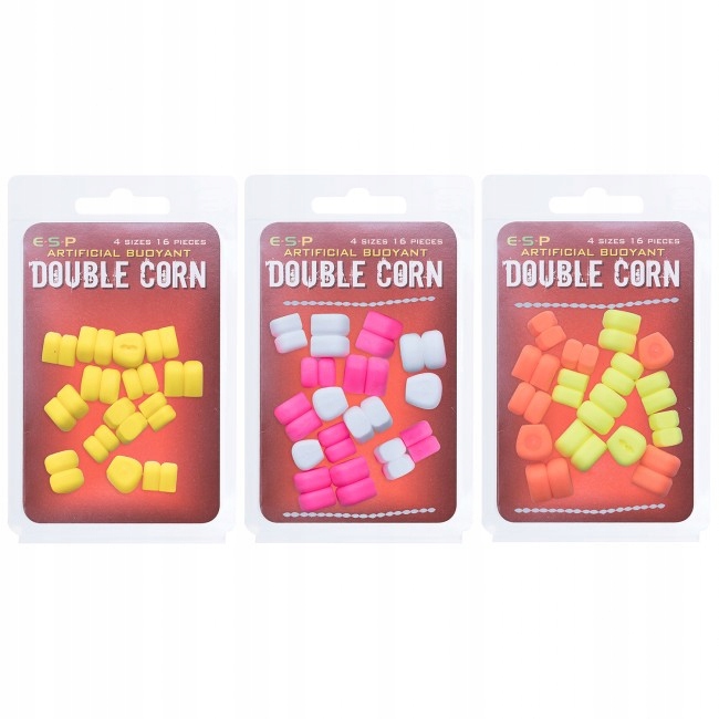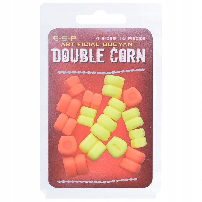Искусственные двойные плавающие кукурузные зерна от ESP, со стопорами для установки на щетину оранжевого и красного цвета. В упаковке 4 разных размера.
