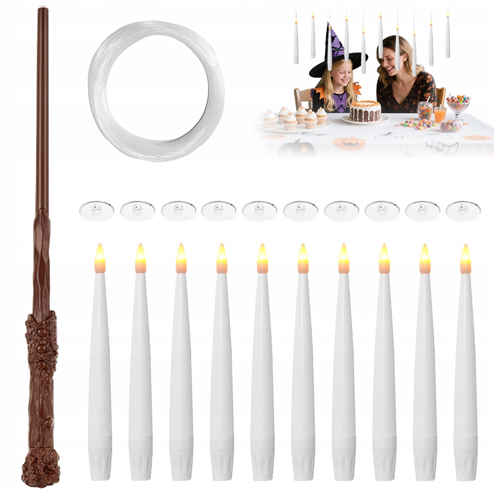 плавающая свеча 15 см, пульт дистанционного управления с палочкой, крючок, изящные наклейки, веревка для подвешивания (около 50 метров) и инструкция (мы не гарантируем английскую версию). Вы можете сделать их сами и комбинировать по своему желанию. Плавающие свечи добавят волшебства вашему дому, а волшебный мир пригласит вас вместе отпраздновать Хэллоуин!