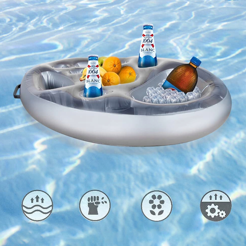 Этот плавающий понтон имеет много отсеков разных размеров, благодаря которому он будет размещать бутылки, стаканы или контейнеры с едой. оснащен двумя боковыми ручками легко захватить и перетаскивать. Благодаря двум балластным танкам, он не падает и не поддерживает баланс на воде. Так что вам не нужно беспокоиться, что ваша еда приземлится в воде.