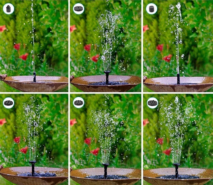 Наш солнечный фонтан имеет 6 различных насадок позволяющий выбрать любую струю воды, например тонкую и высокую или густую и низкую, в зависимости от ваших предпочтений.
