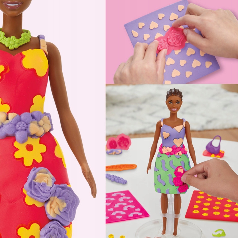 - 4 готовых листа Play-Doh - напоминающего материал с забавными узорами и цветами. Идеально подходит для создания одежды и аксессуаров для кукол Барби (куклы продаются отдельно).