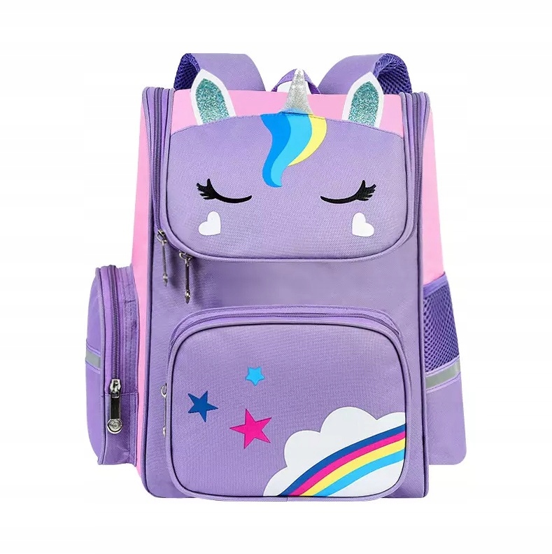 Рюкзак красивого фиолетового цвета, симпатичные молнии со смайликами, детали: рог и ушки единорога (подкладка, сетчатый карман, ушко для подвешивания рюкзака, например, на крючок в гардеробе).