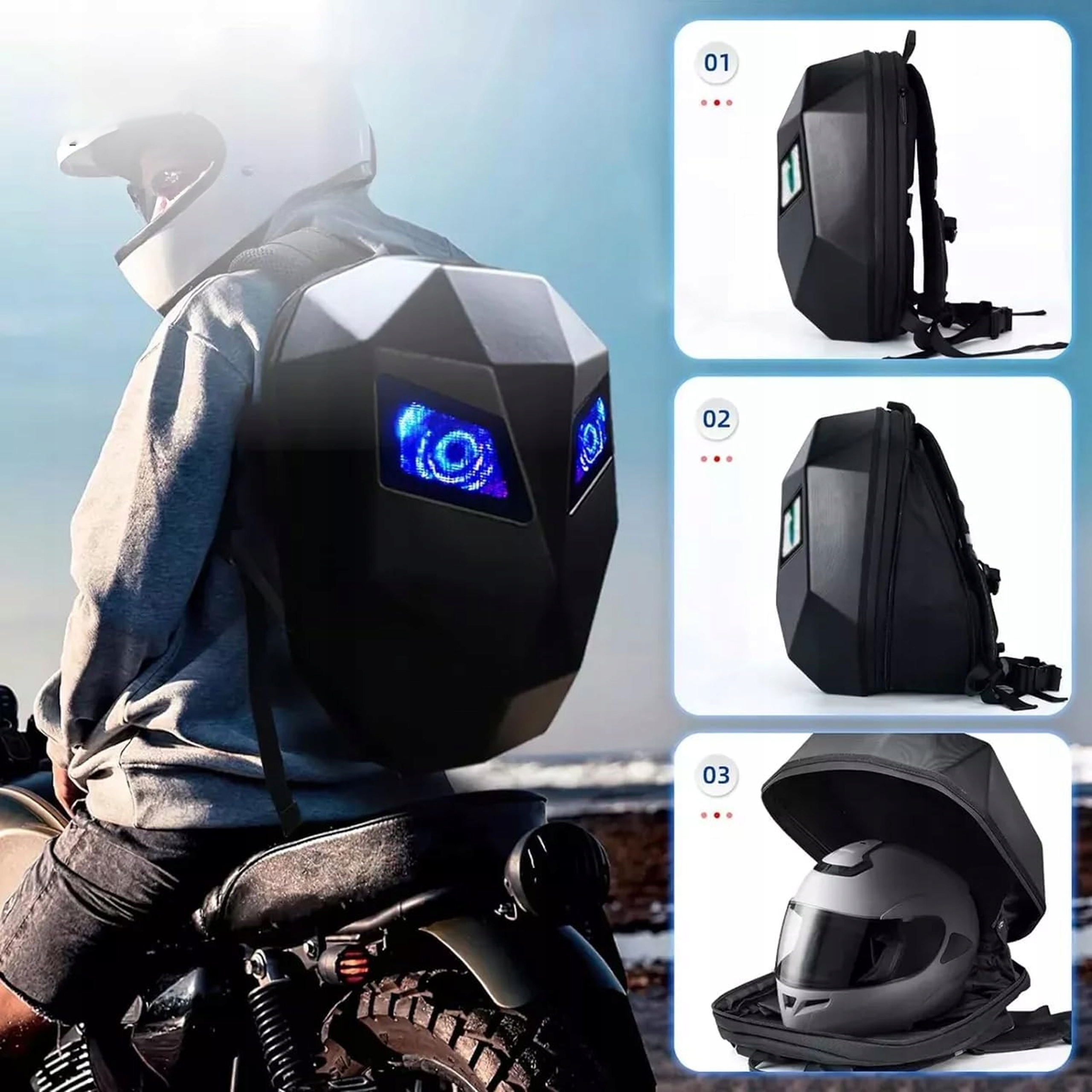 PLECAK NA MOTOR Z OCZAMI LED MOTOCYKLOWY NA KASK EKRAN BLUETOOTH USB DUŻY