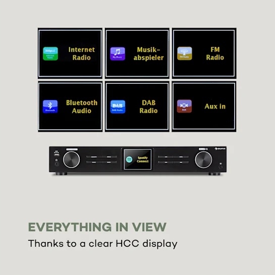 Цифровой Hi-Fi-тюнер auna iTuner 320 BT обладает множеством функций и предлагает широкий спектр потенциальных источников звука. Доступный тюнер интернет-радио можно подключить напрямую к сервису потоковой передачи музыки Spotify или обеспечить доступ к более чем 20 000 интернет-радиостанций. Другие функции включают в себя уникальную функцию BT для цифровых Hi-Fi-тюнеров для потоковой передачи со смартфонов, планшетов и ноутбуков, а также цифровой радиотюнер DAB+/FM, каждый из которых имеет функцию RDS для получения дополнительной информации, сопровождающей программу. Благодаря такому огромному количеству радиостанций вы сможете найти невероятный выбор музыки и новостей со всего мира. Благодаря особенно эффективной антенне WLAN цифровой HiFi-тюнер auna iTuner 320 BT может транслировать музыку по всей квартире, управляясь через приложение UNDOK на смартфоне или планшете. В комплект поставки auna iTuner 320 входит пульт дистанционного управления. Благодаря поддержке DLNA и UPnP практически все WLAN-совместимые устройства можно подключить к iTuner 320 в вашей домашней сети. Конечно, это устройство также имеет передний порт USB, а задние разъемы обеспечивают аналоговые и цифровые соединения. Благодаря этим подключениям цифровой HiFi-тюнер auna iTuner 320 BT можно интегрировать в существующую стереосистему. В середине передней панели, похожей на матовый алюминий, находится дисплей HCC. Этот четкий цветной дисплей еще больше облегчает и без того простое управление устройством. Auna iTuner 320 BT был разработан таким образом, чтобы его можно было интегрировать в существующую систему HiFi формата 43 см. Тюнер интернет-радио предоставляет большой набор разъемов для подключения необходимых динамиков.