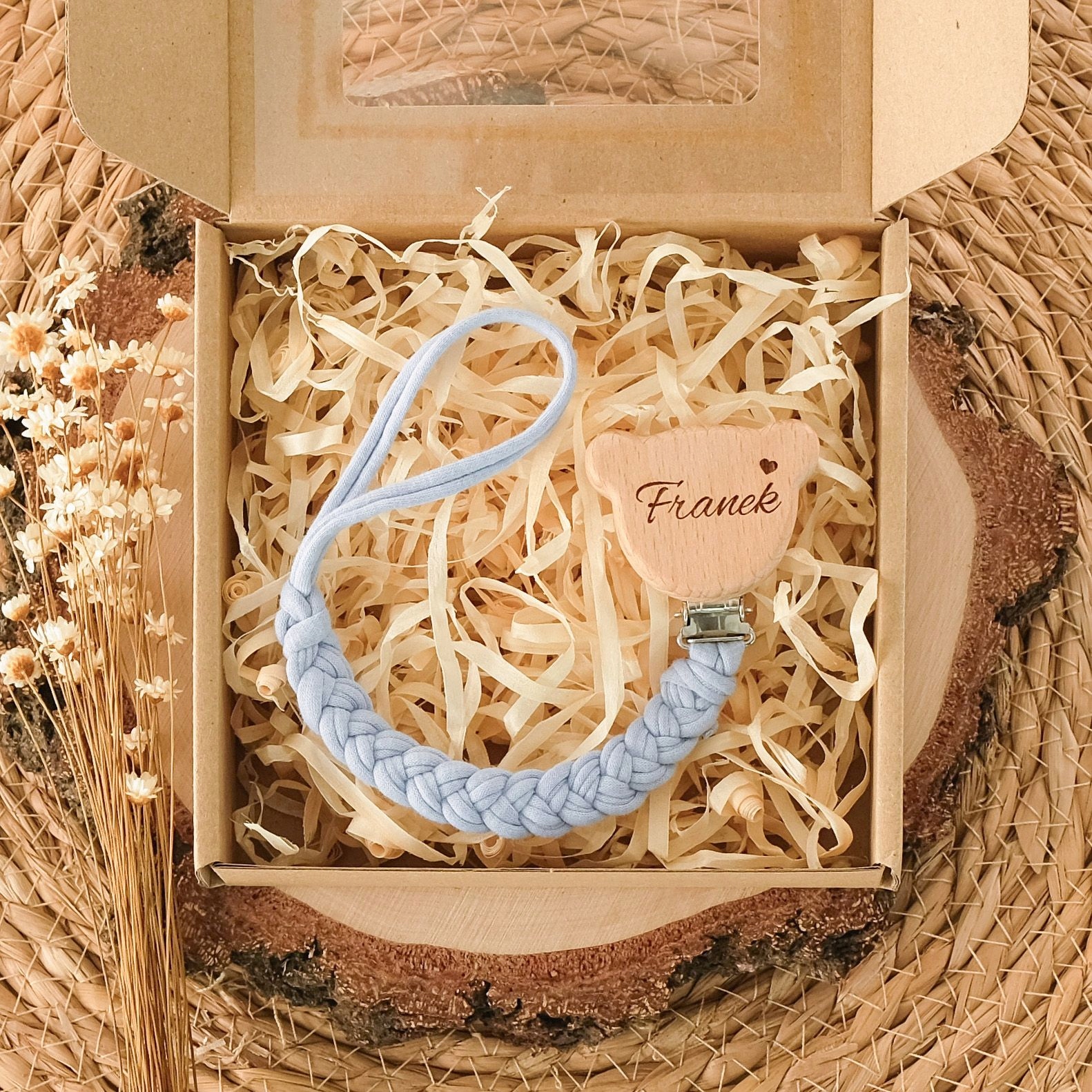 Плетеная соска-подвеска Котёнок, гравировка имени + вторая в подарок