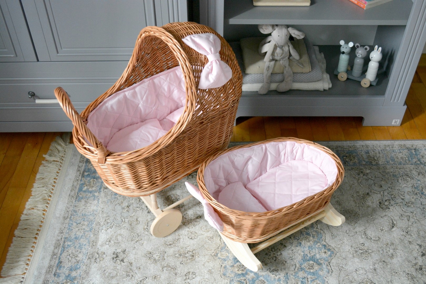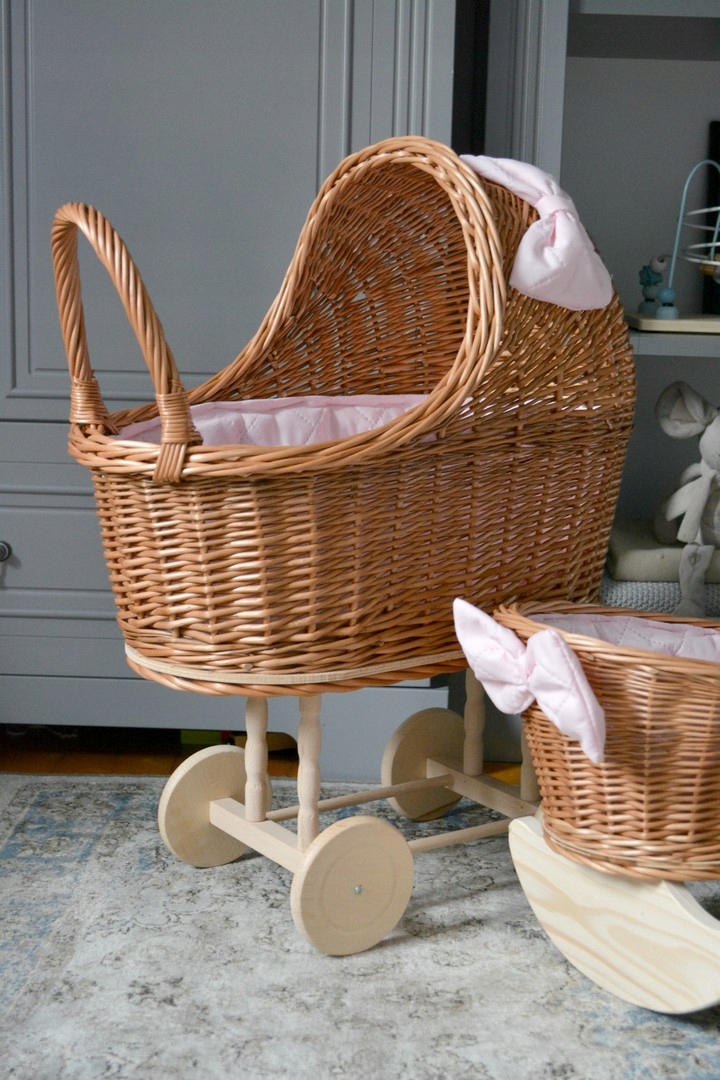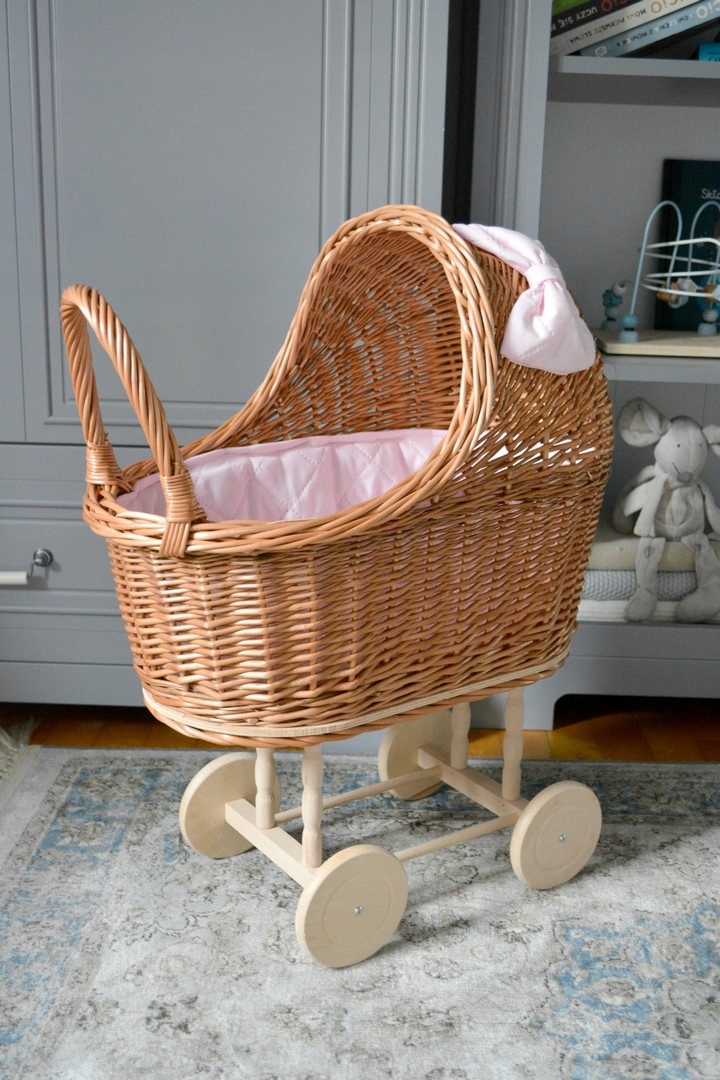 Коляска плетеная + люлька для куклы, натуральный цвет - тканевая отделка розового цвета.