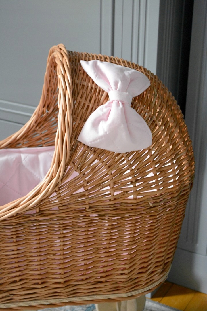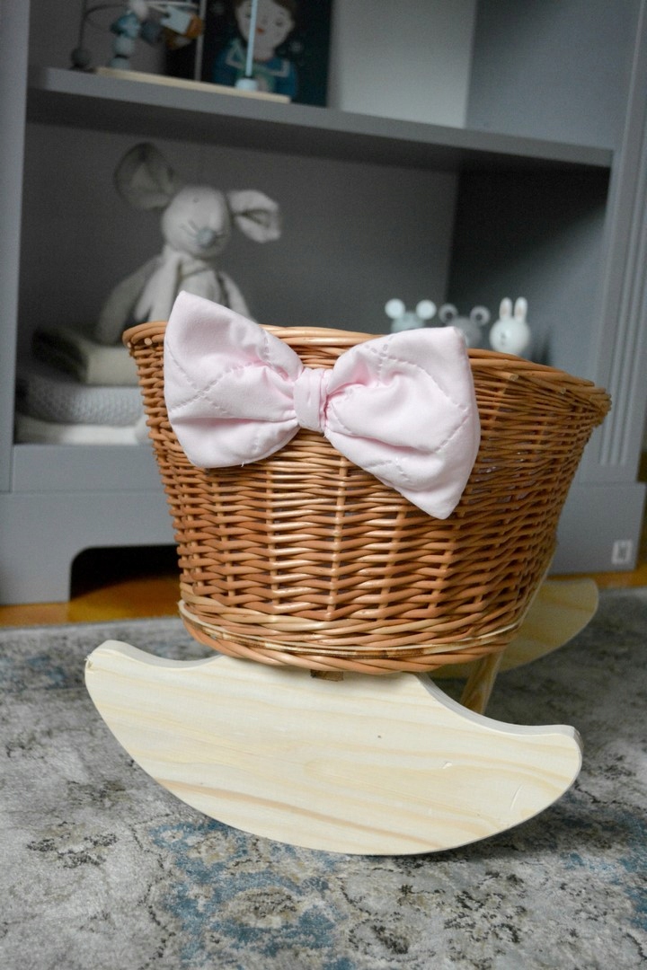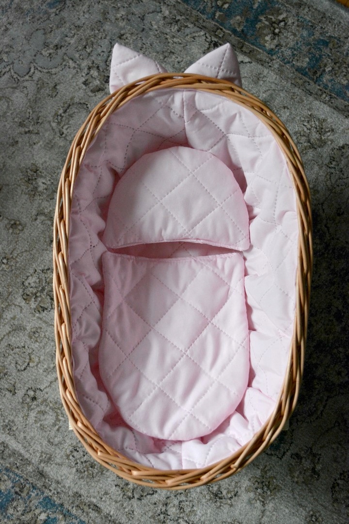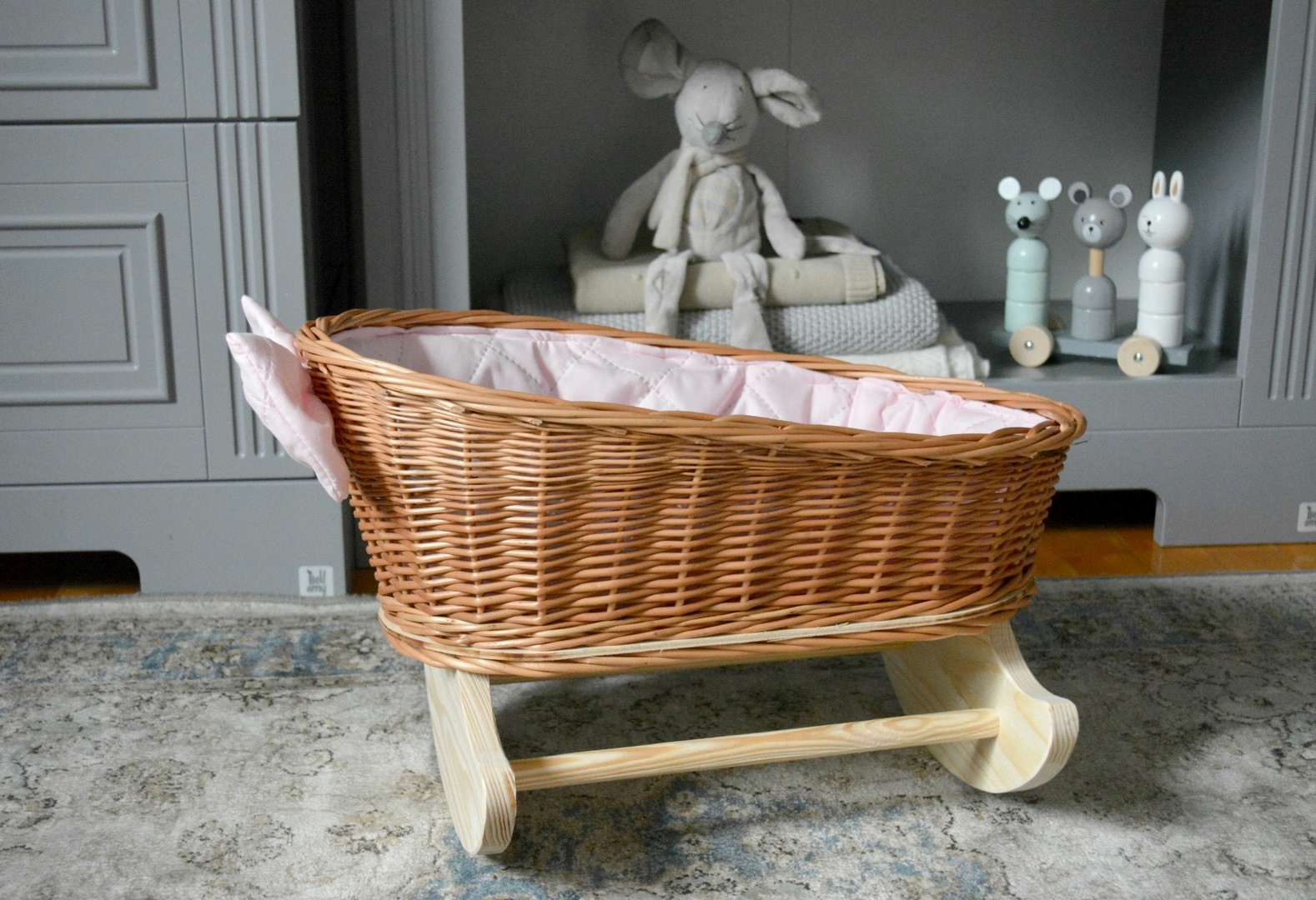 Коляска плетеная + люлька для куклы, натуральный цвет - тканевая отделка розового цвета.