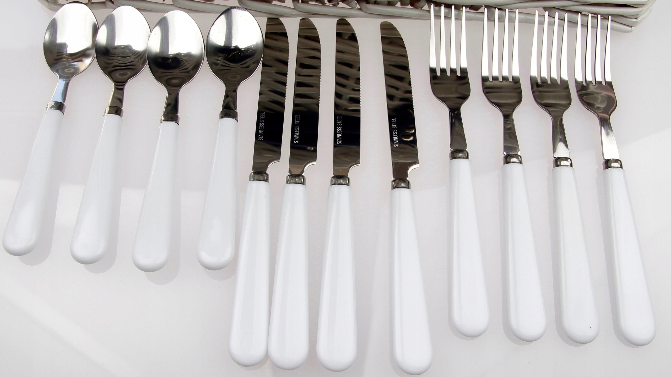 ✅4 ложки, 4 ножа и 4 вилки каждая из нержавеющей стали с ручками из белого пластика.