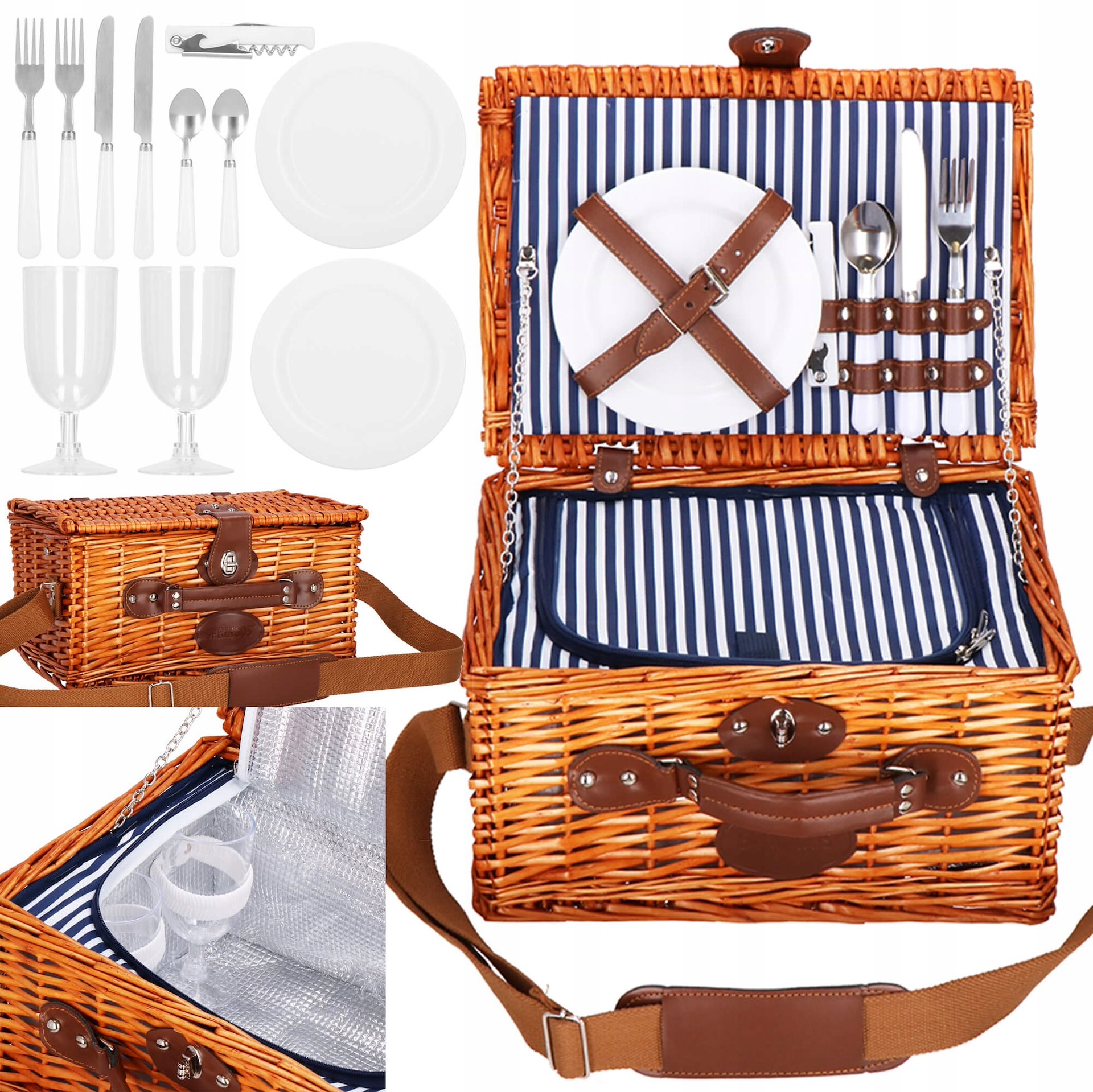 kosz piknikowy wyposaony jest wszelkie akcesoria potrzebne do tego, abyzyz świeżym Powietrzu. В нем вы найдете набор столовых приборов, тарелки и очки для четырех человек! мы не забыли о такой полезной маленькой вещи, как открытие штопора.