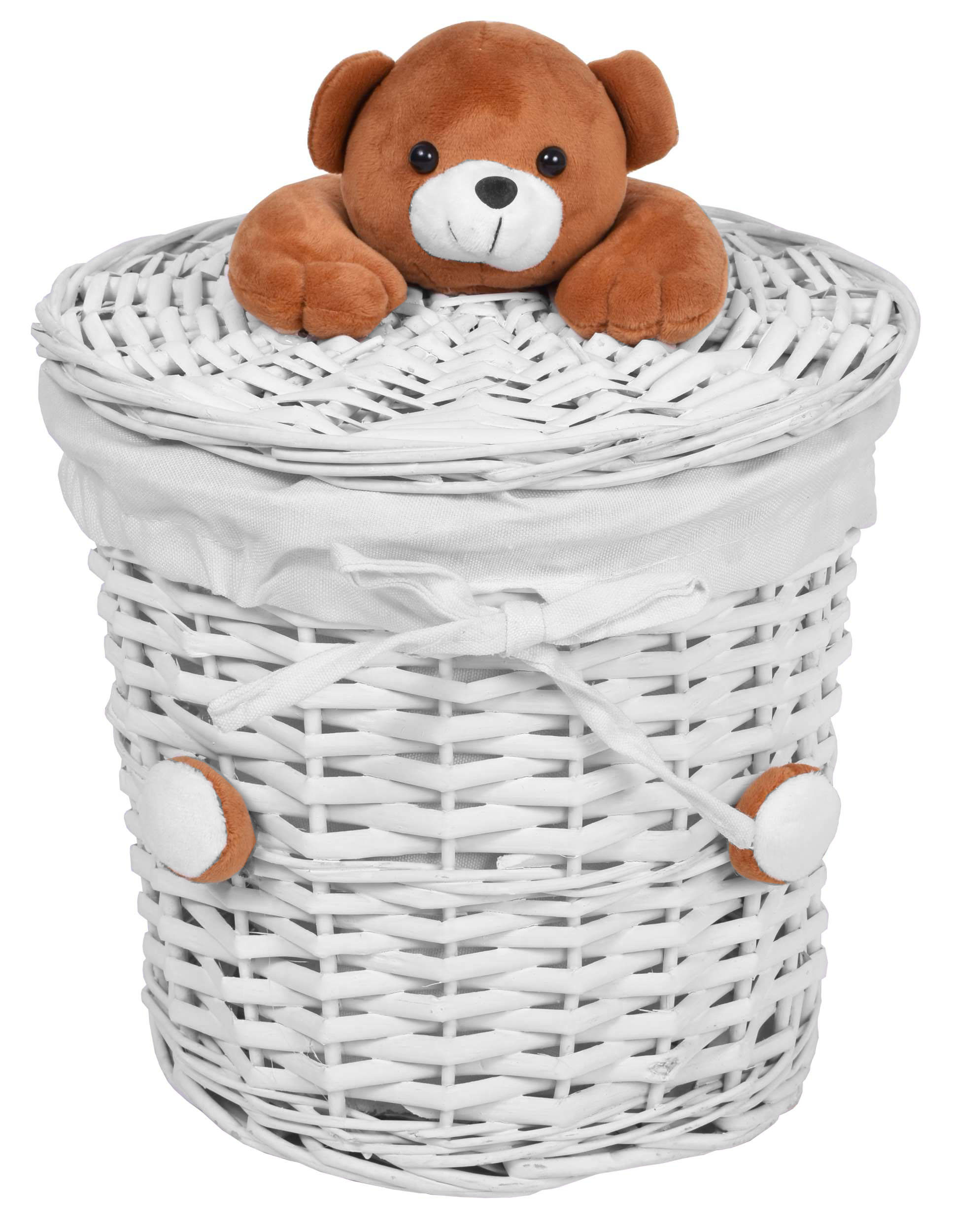 Плетеная корзина идеально подойдет для хранения белья в ванной. Это очень приятное дополнение, которое придает индивидуальность оформленным помещениям. Изделие изготовлено из плетения ровного переплетения, внутри отделано прочной льняной подкладкой кремового цвета. На крышке сверху изображен приятный на ощупь плюшевый мишка.