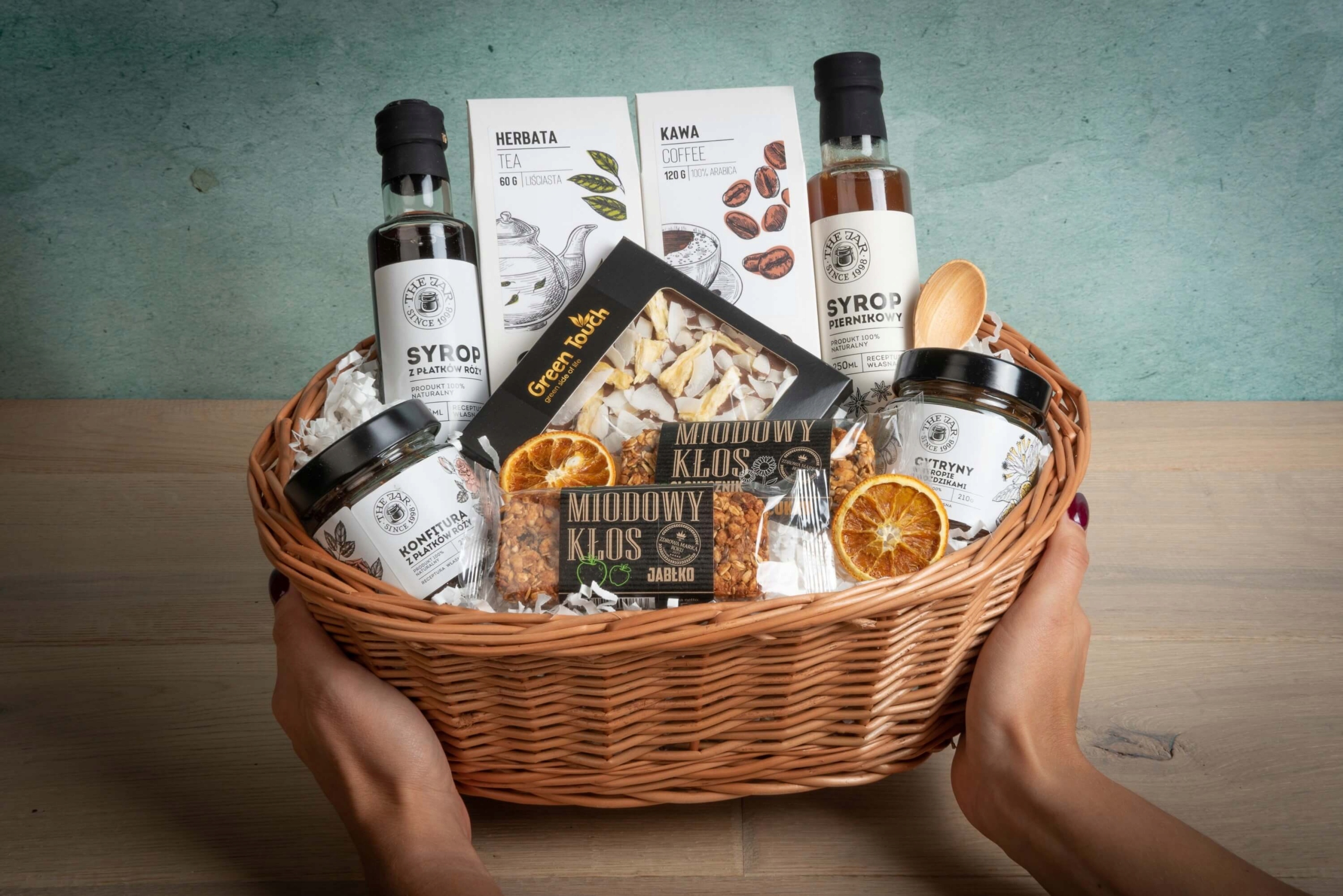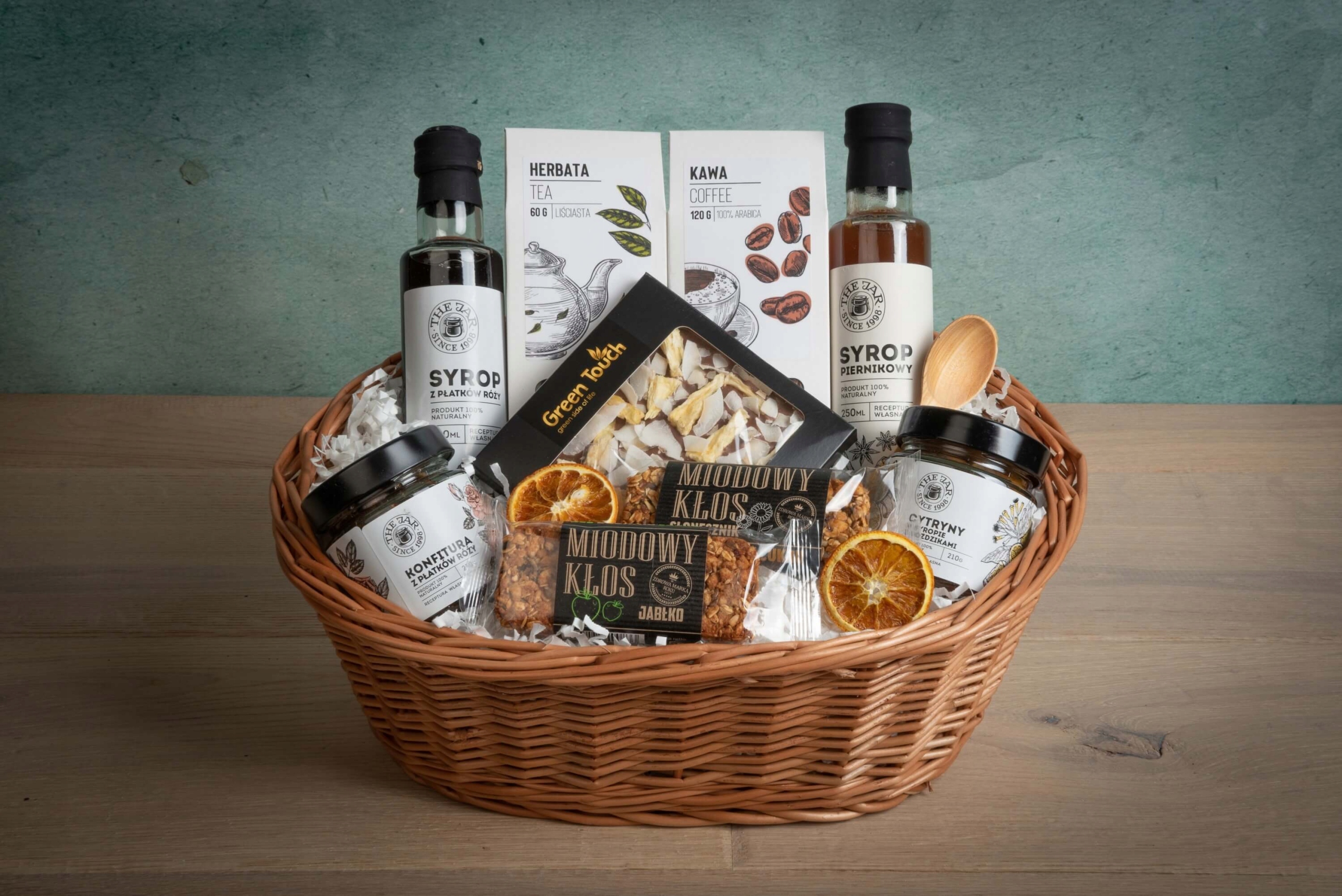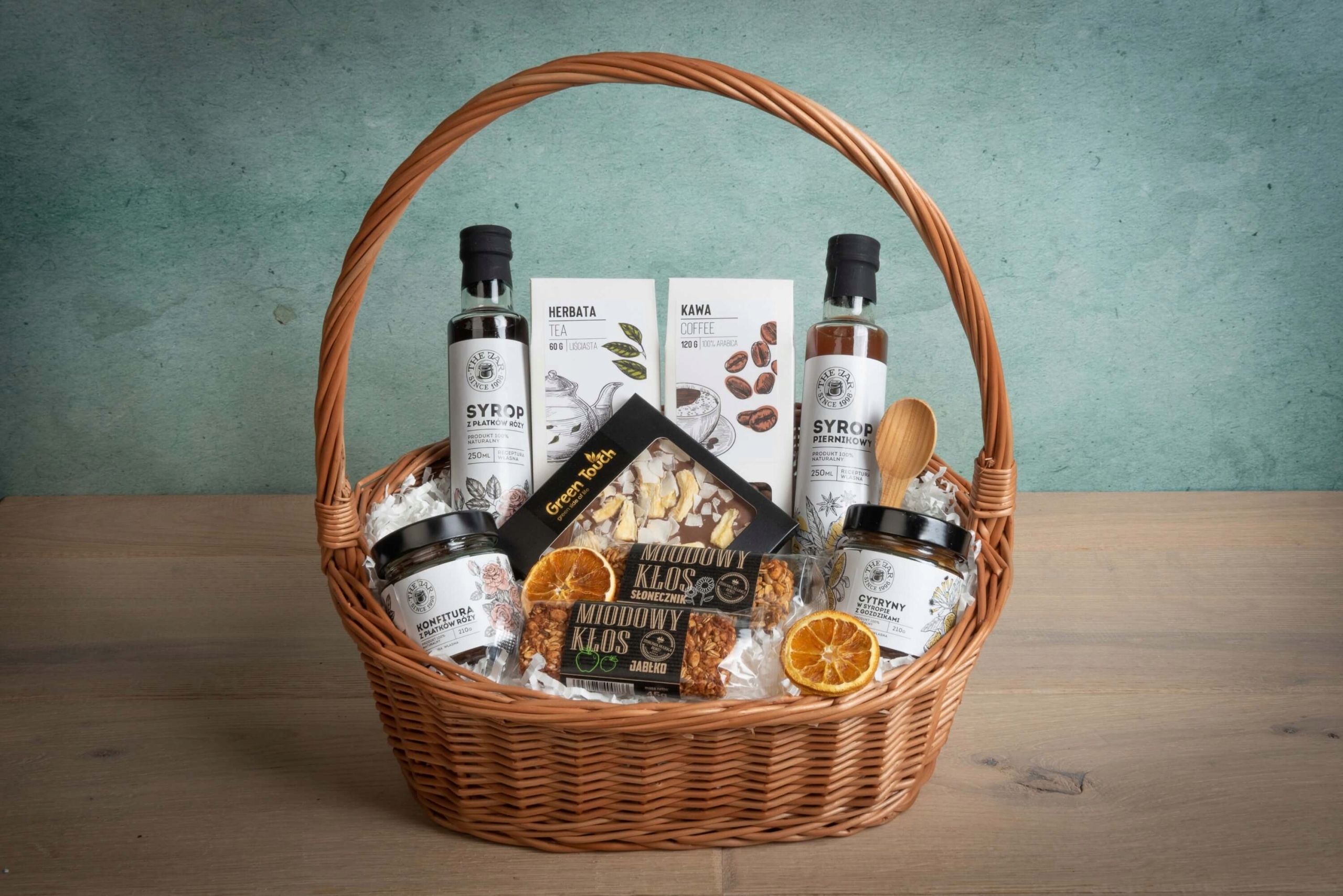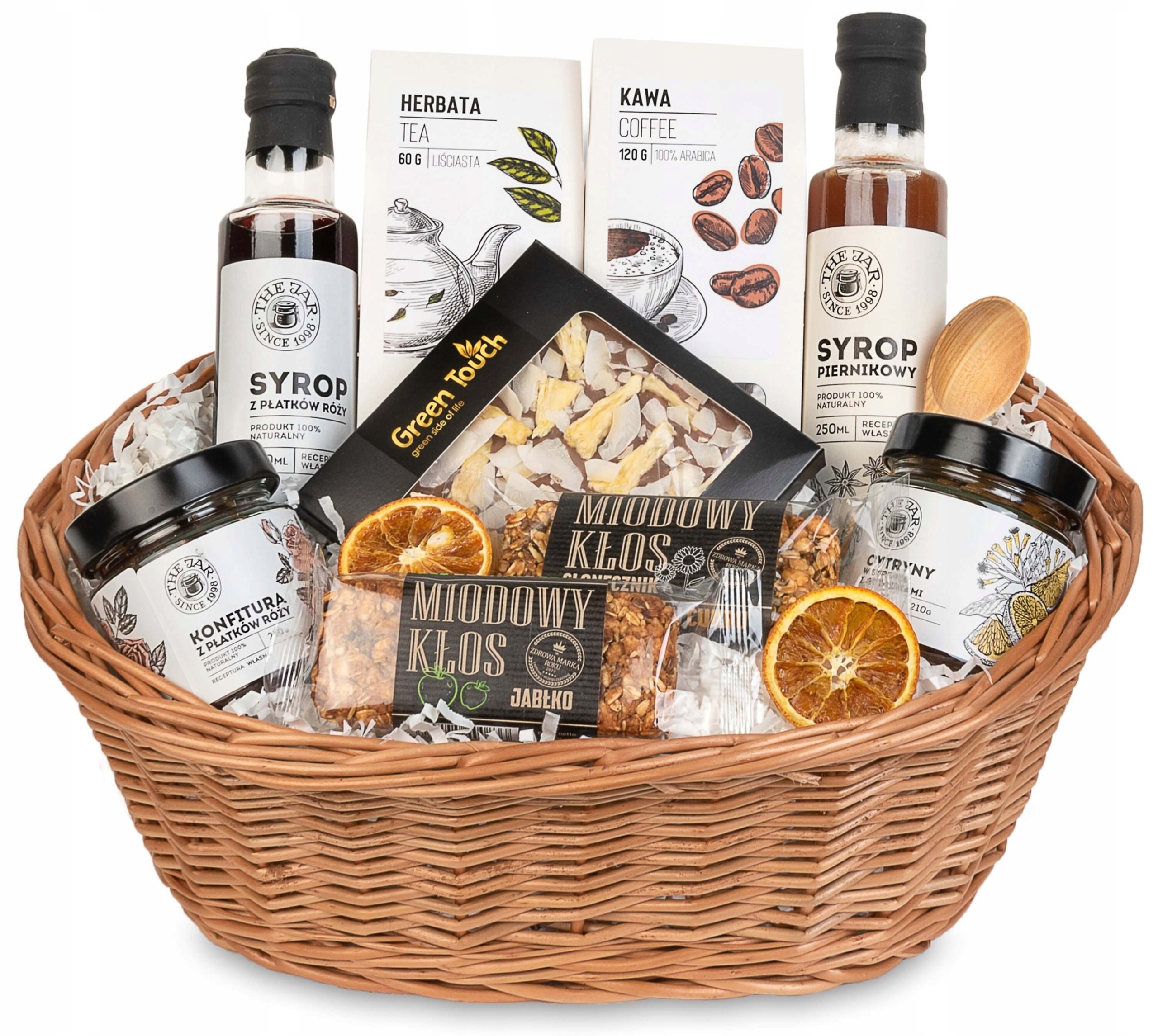 В нашей подарочной корзине собраны лучшие кофейные зерна и ароматный черный чай Green Touch. Мы добавляем эксклюзивные сиропы и джемы из лепестков роз, медовые батончики и настоящий домашний шоколад. Красоту корзины дополняют сушеные апельсины и деревянная ложка - прекрасный подарок ценителю вкуса.
