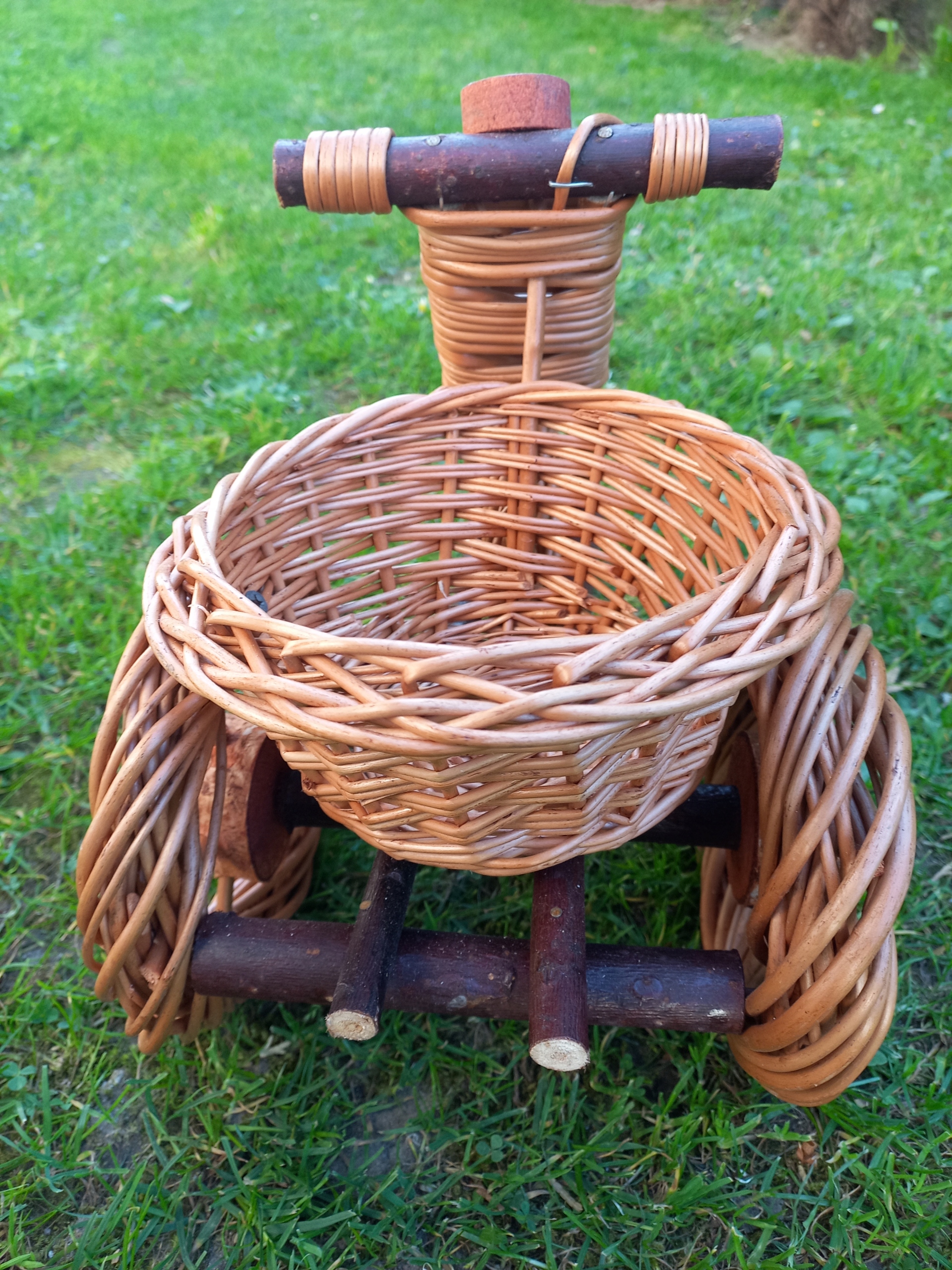 Тщательно изготовленный декоративный плетеный велосипед для сада. Велосипед изготовлен из натурального, легкого плетения. Польский продукт.