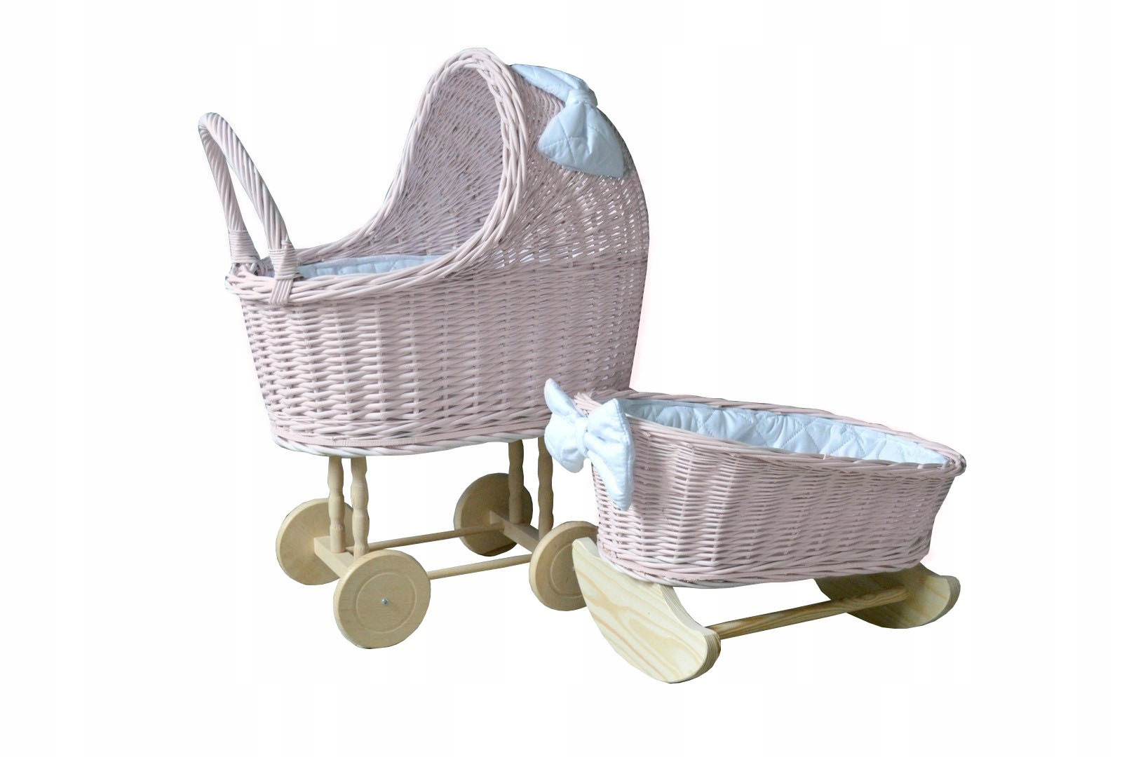 Коляска плетеная + люлька для куклы, тканевая отделка светло-розово-белая.