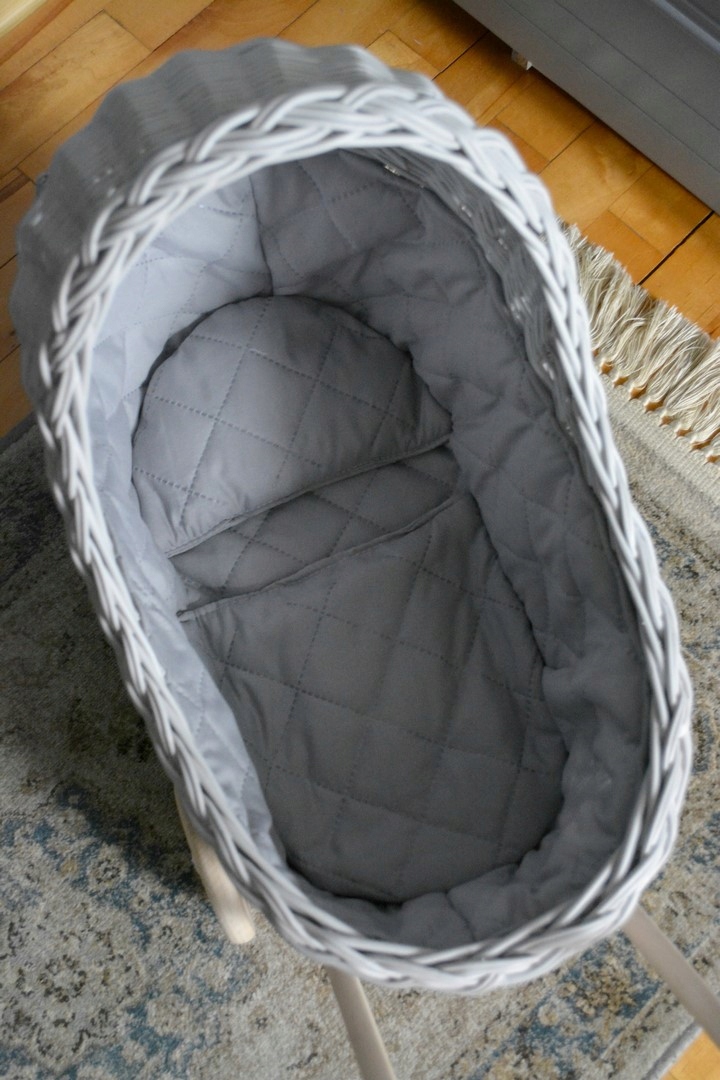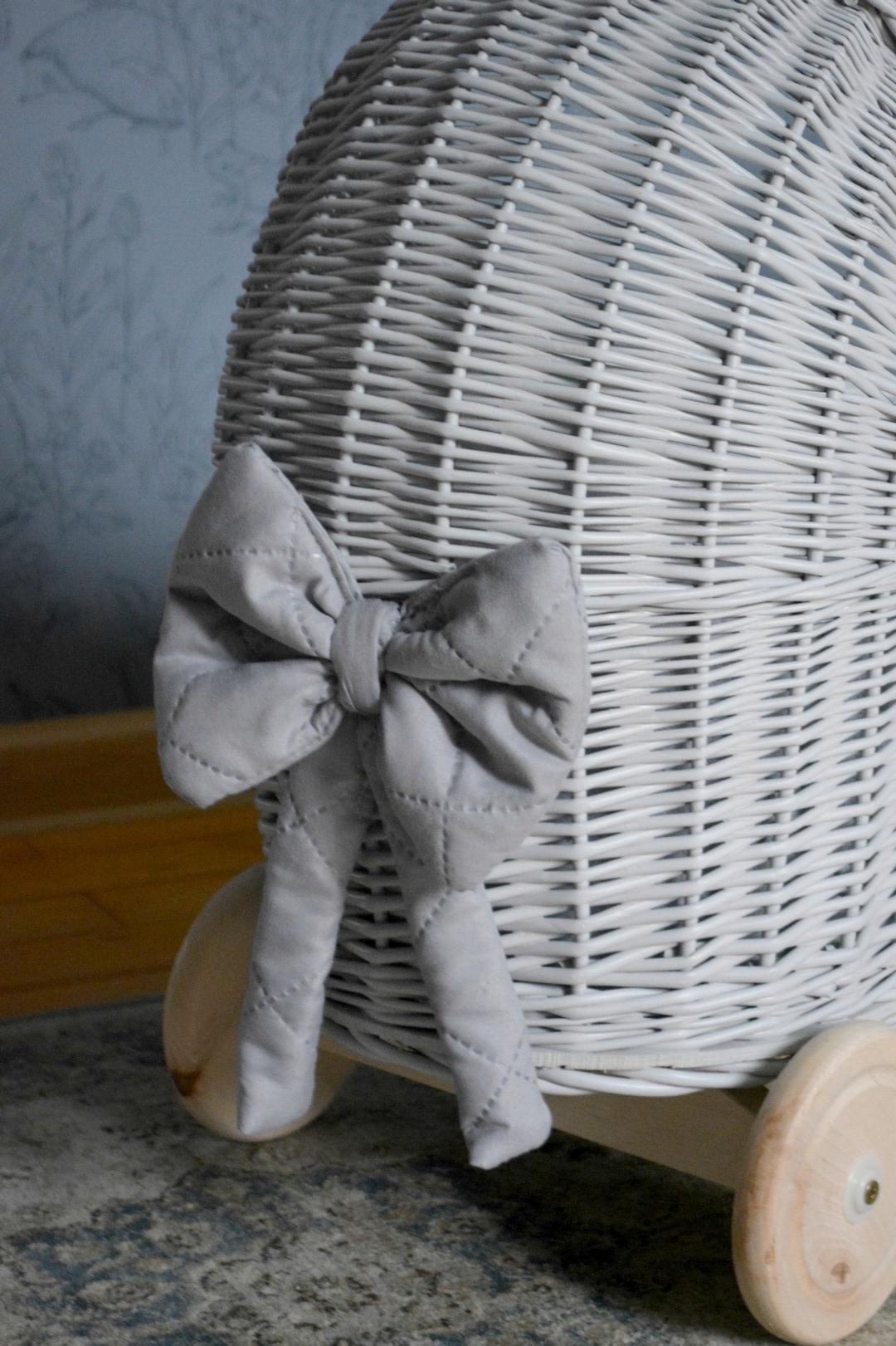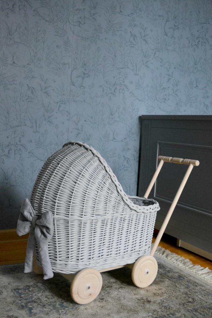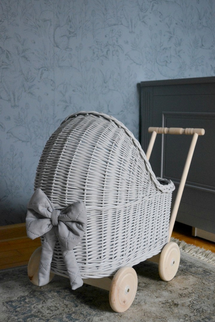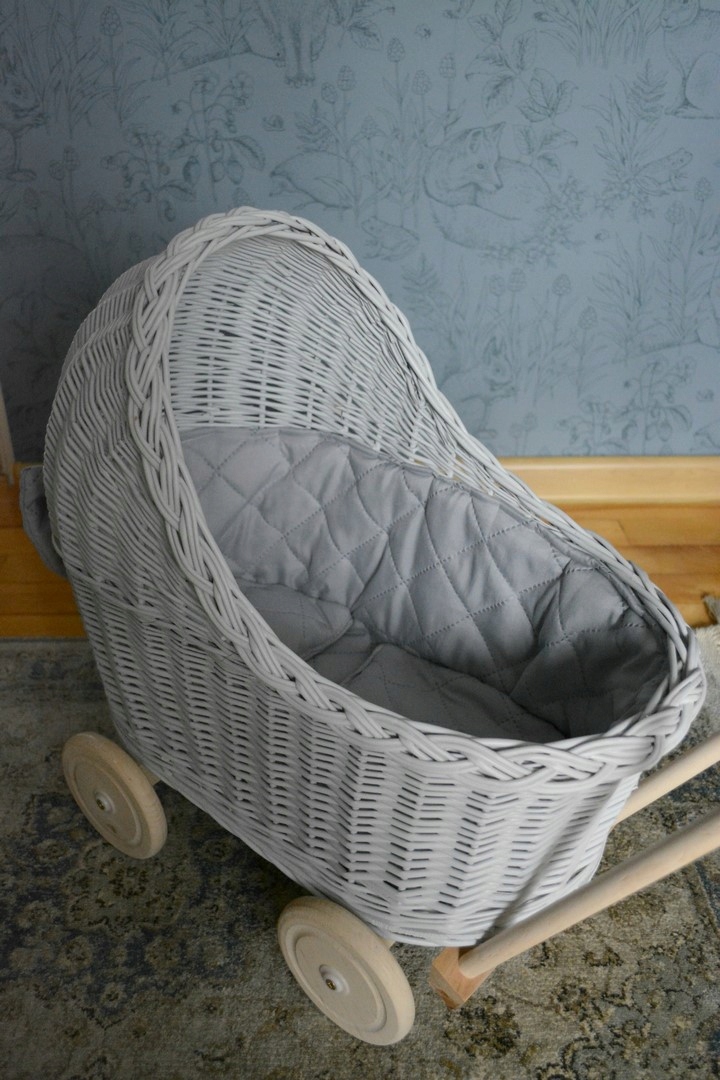 Плетеная коляска для кукол СЕРЫЙ толкатель + подстилка