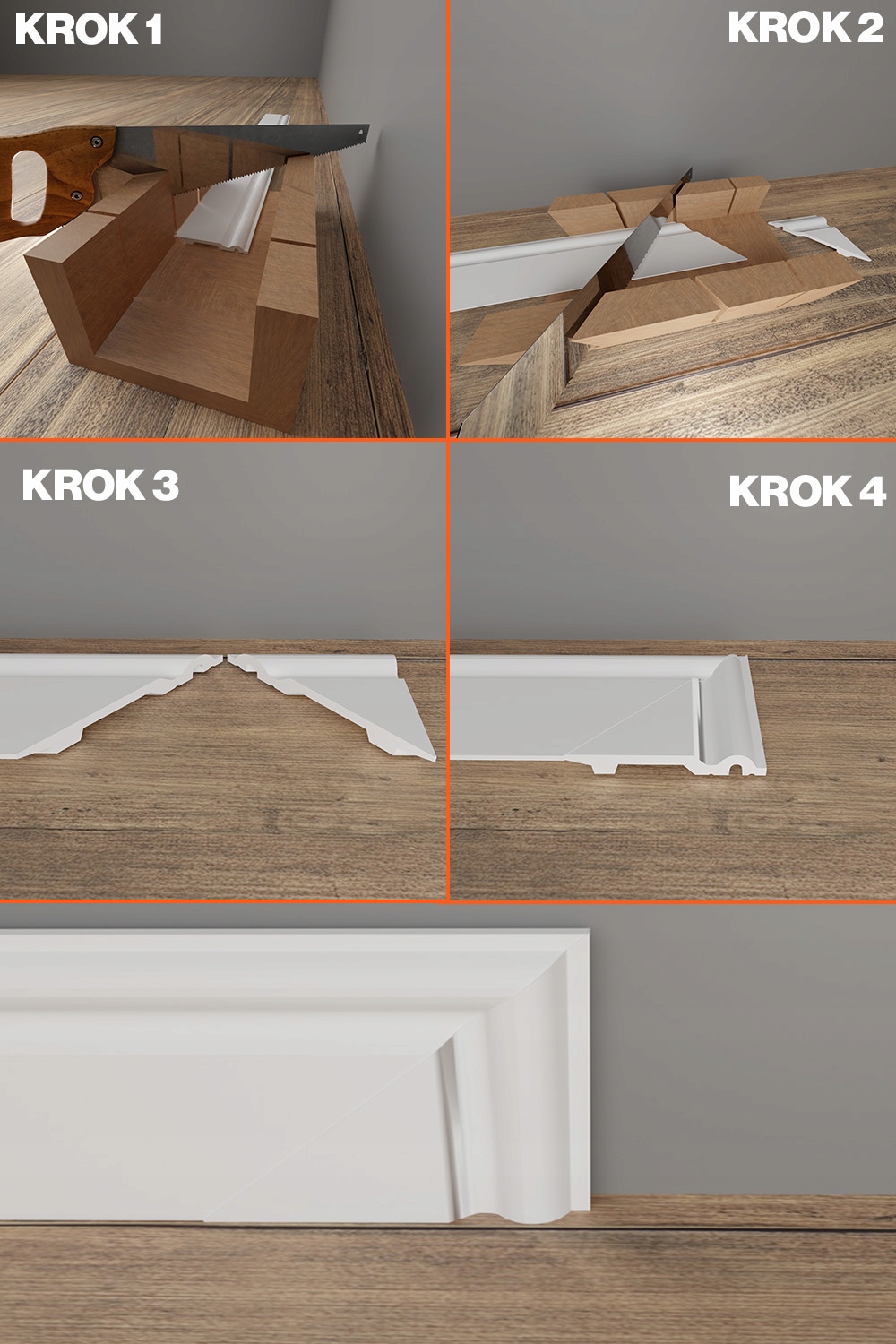 Поместите плинтусную лодку на основе порезов. Установите полосу в положение, показанное на шаге 1, чтобы край идеально установил под углом 45 градусов. После разрезания планка мы получим часть, которая будет служить нам в качестве финала. Затем вырежьте полосу в противоположном направлении под углом 45 градусов, чтобы создать место для установки конца нашей полосы. Концовка приклеена к нашему вдохновляющему сборочному клею. Удалите лишний клей, используя губку. Для этого мы можем использовать пластиковый пакет или шпатель, чтобы равномерно удалить клей