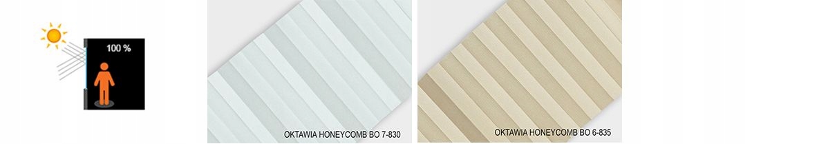 OCTAWIA и MALAYSJA HONEYCOMB BLACKOUT – материал, комбинированный из двух складок. Для ткани «соты» характерны более мелкие складки в складках. В разрезе он напоминает соты. Благодаря специальной структуре с микроперфорацией и внутреннему алюминиевому покрытию использует воздушные камеры для дополнительной изоляции (звуковой и тепловой) и тем самым повышает энергетические параметры окна. Летом тепло не поступает в помещение, а зимой тепло не выделяется из помещения. Кроме того, соты повышают эстетику интерьера, позволяя разместить внутри ткани струнные механизмы и направляющие. Это решение также гарантирует отсутствие зазоров в местах отверстий для струн. Ткань затемняет комнату на 100%.
