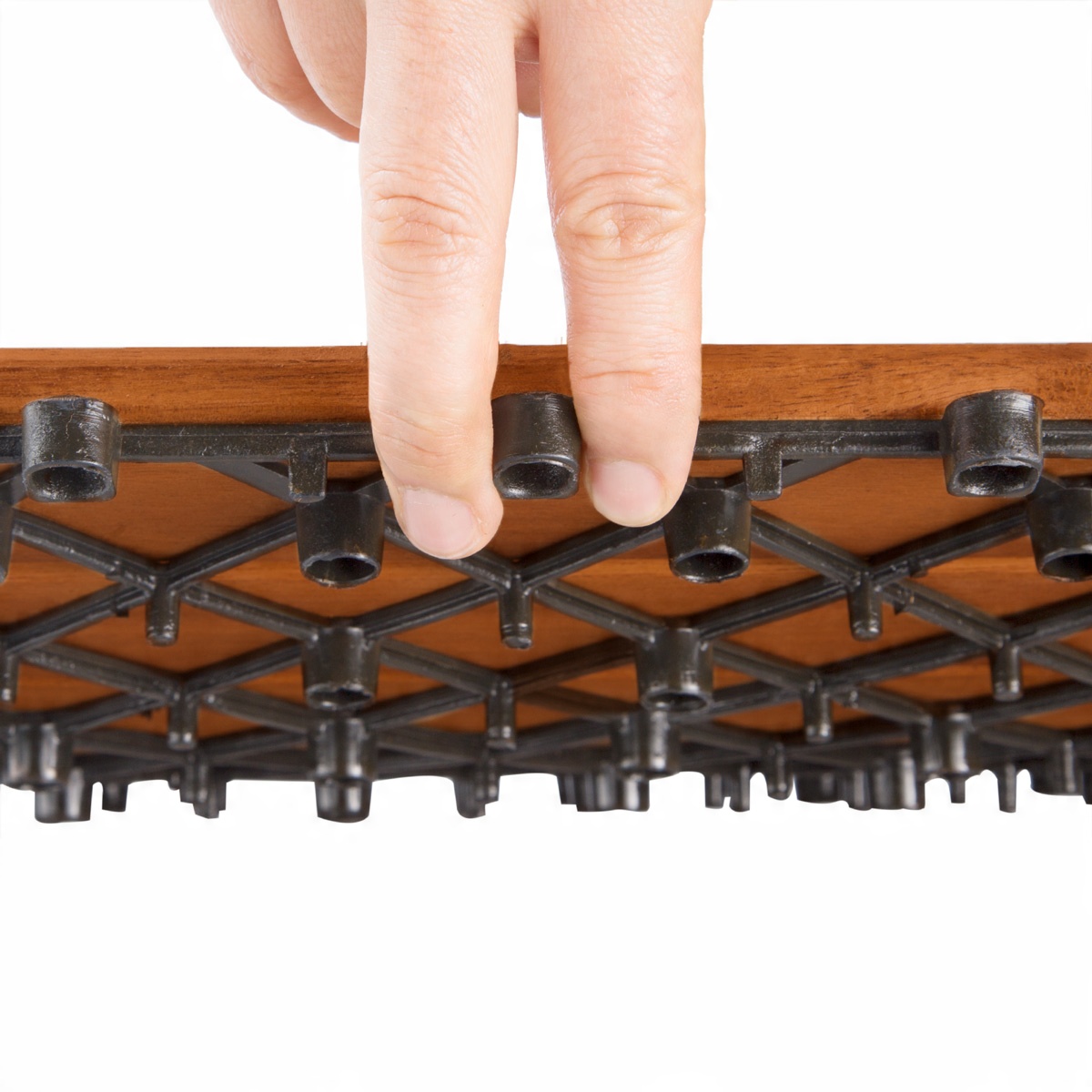 Деревянная плитка имеет вставную систему, поэтому ее можно укладывать очень быстро и легко без использования инструментов.