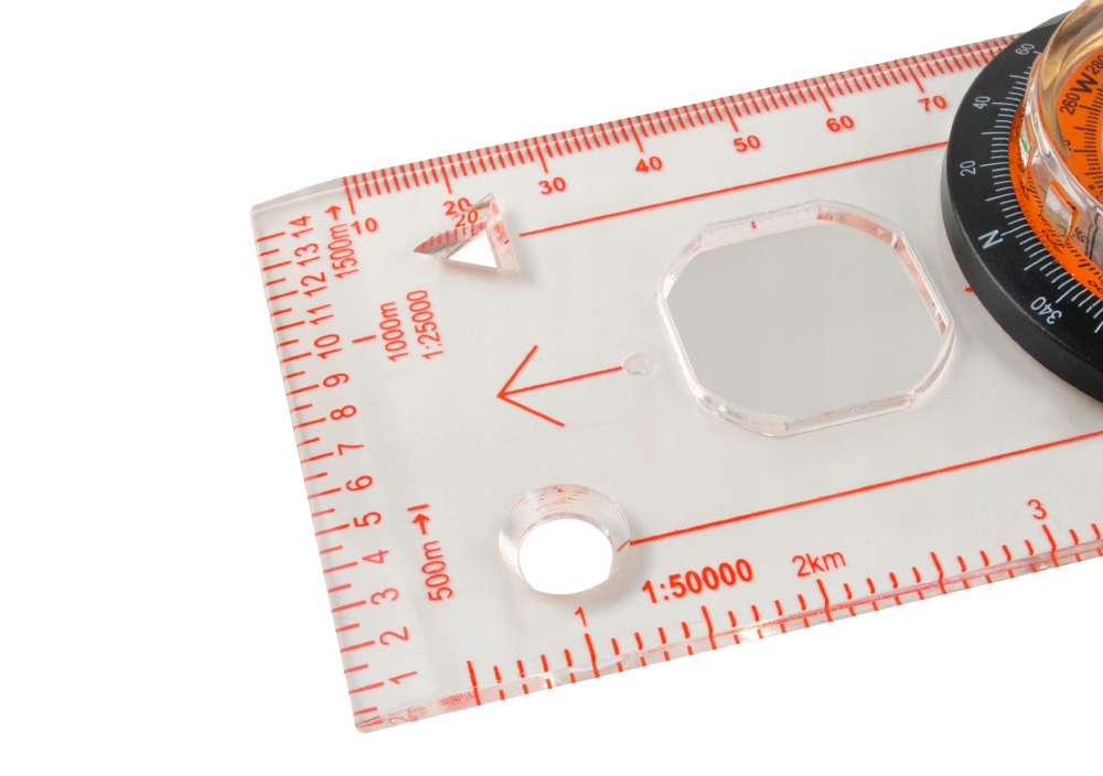Компас размещается на прозрачной подставке с линейкой, которая также имеет увеличительное стекло, позволяющее точно читать карту. Кроме того, имеются круглые отверстия и треугольник позволяют рисовать на карте символы карандашом.