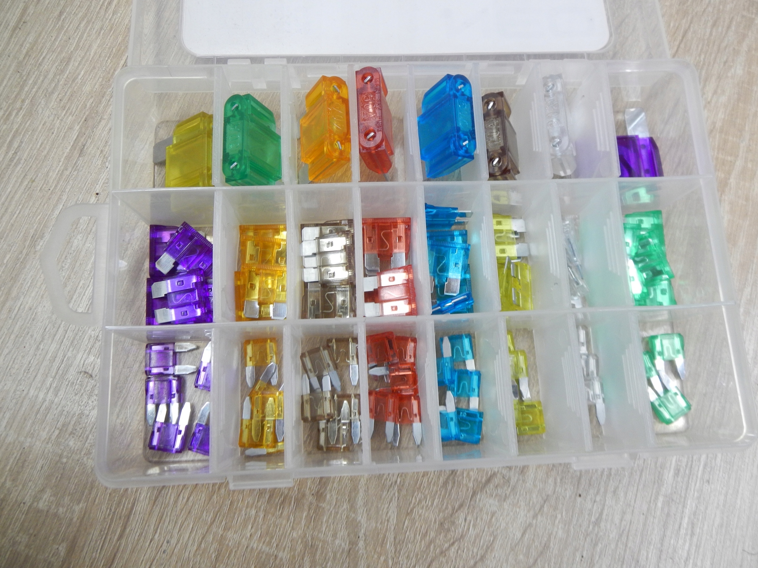 Набор предохранителей автомобиля. Поликарбонатное жилье. В наборе: ширина 11 мм - 5 x 3a, 5 x 5a, 5 x 7,5a, 5 x 10a, 5 x 15a, 5 x 20a, 5 x 25a, 5 x 30 -ящики 19 мм - 5 x 3a, 5 x 5a, 5 x 7,5a, 5 x 10a, 5 x 15a, 5 x 20a, 5 x 25a, 5 x 30 - ящик 29 - 1 x 20a, 1 x A, 1 x 40a, 1 x 40a, 1 x 40a, 1 x 40a, 1 x 40a, 1 x 40a, 1 x 40a, 1 x 40a, 1 x 50a, 1 x 60a, 1 x 70a, 1 x 80a, 1 x 100a
