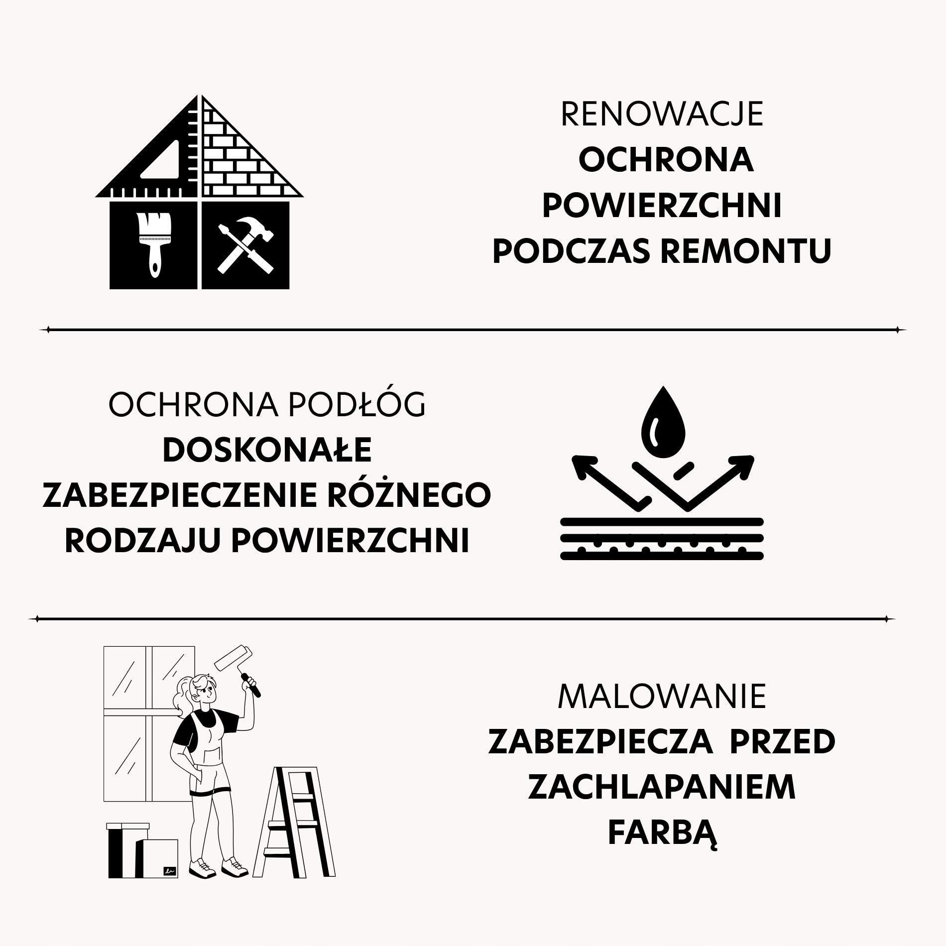 О: Для мелких малярных и отделочных работ достаточно толщины 35 мкм. Для интенсивной работы, перемещения более тяжелой мебели или инструментов лучше выбрать варианты с толщиной 40 или 60 мкм.