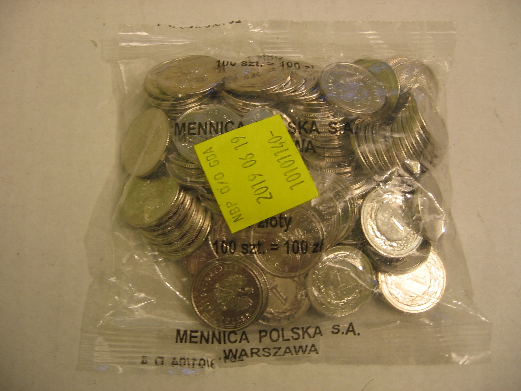Mint Bag с 100 кусками 1 Zloty монет с 2019 года, изготовленных из меди (MN25)
