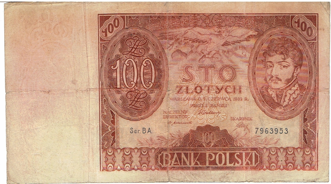 pln 100, 2 июня 1932 года. Варшава. Банк Польши. Серия BA 7963953