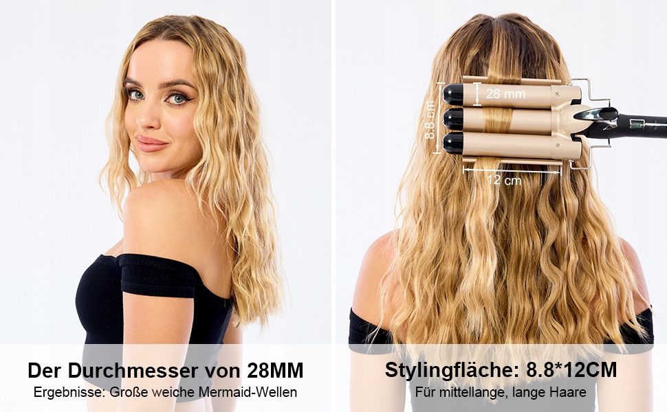 Волосы сжимаются между двумя нагретыми пластинами. Широкие пластины с тройными бочонками позволяют быстрее создавать волны на волосах. Щипцы для завивки AIMERVO с керамическими пластинами создают волны по всей длине волос примерно за 10 минут.