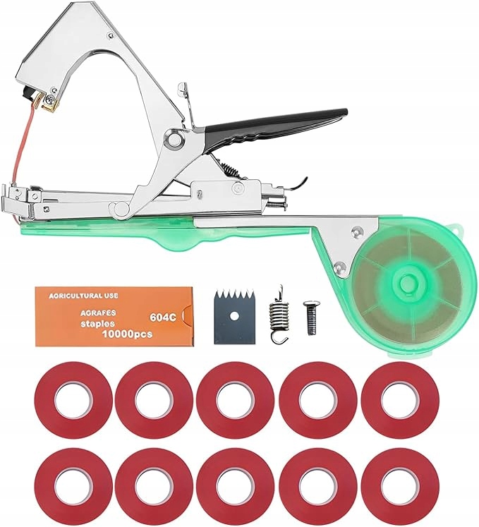 - Комплектация аксессуаров: инструменты включают в себя: машину для подвязки сельскохозяйственных растений, покупка дополнительных аксессуаров не требуется, используйте напрямую, в комплект поставки входят: 1 устройство для подвязки растений, 10 рулонов ленты, 1 набор сменных лезвий, 1 коробка скоб