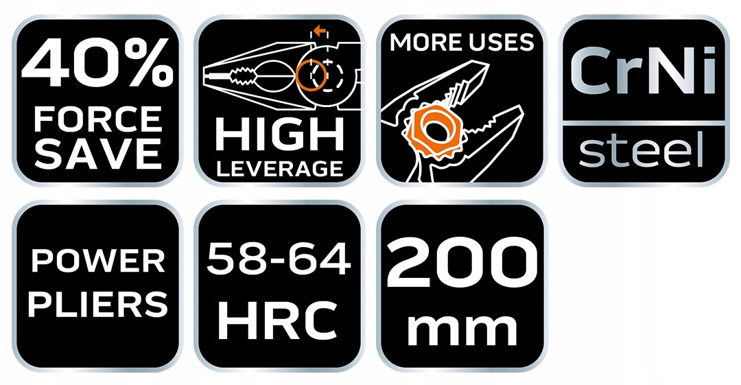 Кусачки прямые удлиненные 40% FS NEO (арт. № 01-155), длиной 200 мм, предназначены для захвата различных предметов. Они изготовлены из высококачественной хромоникелевой стали с антикоррозионной защитой. Двухкомпонентная рукоятка с резиновыми элементами предотвращает соскальзывание руки при использовании инструмента. Зубчатая поверхность губок облегчает отвинчивание винтов и гаек. Конструкция плоскогубцев позволяет снизить силу, прикладываемую к давлению, на 40%.