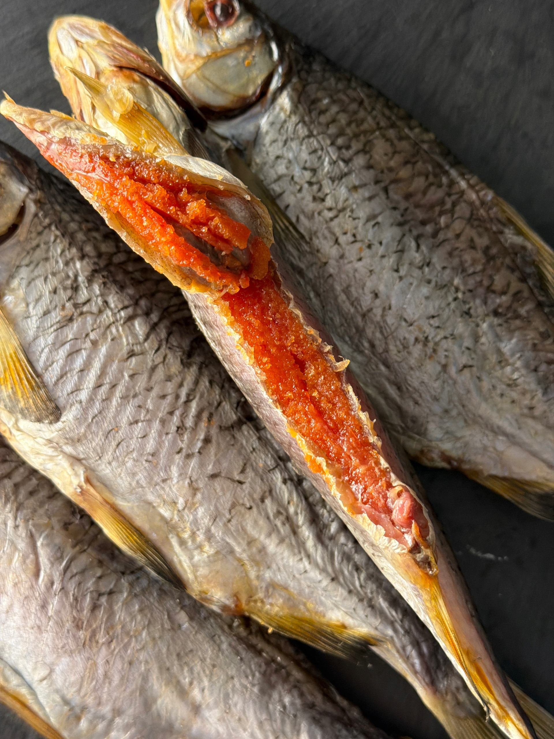 Рыба плотва сушеная без чешуи 100% с икрой цельная закуска к пиву 300г