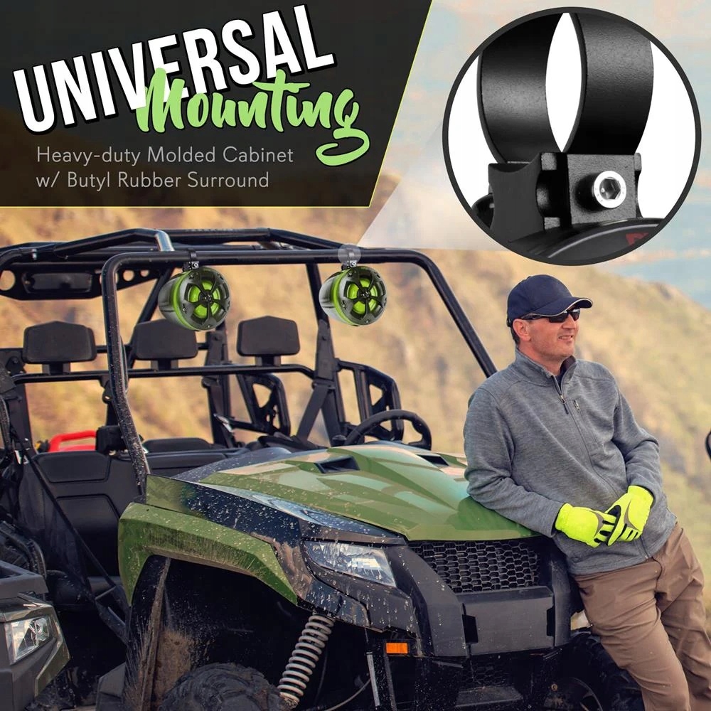 Увеличьте мощность вашего транспортного средства: 800 Вт-пайлская система динамиков внедорожников является идеальным решением для высококачественного звука на лодке, ATV, UTV, Quad, Jeep и других транспортных средствах для бездорожья! Набор содержит два пассивных двухсторонних динамика внедорожника диаметром 10,16 см.