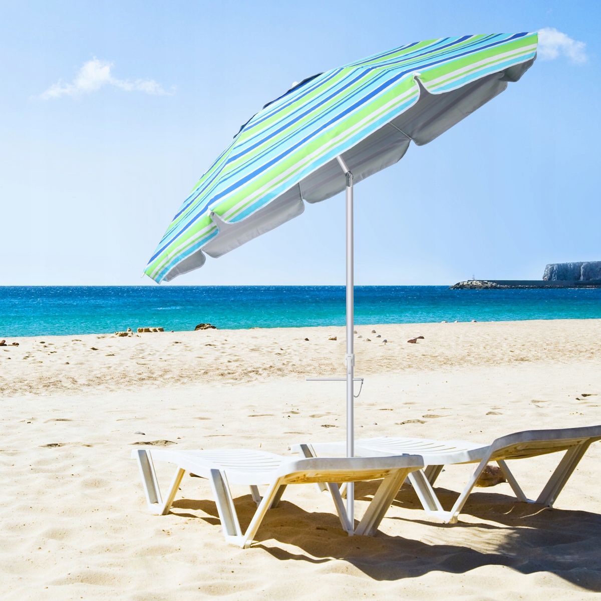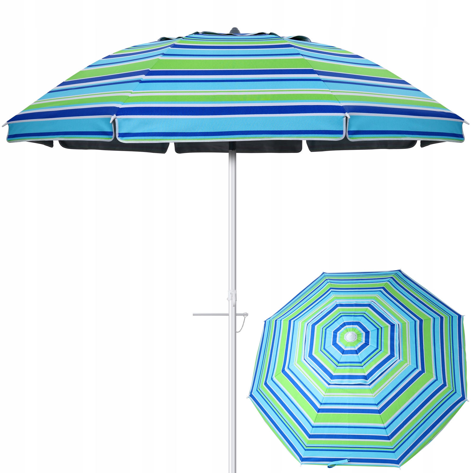 ✅Изготовлен из прочного, нержавеющего материала. Прочные алюминиевые стойки со встроенным устройством крепления к песку надежно удерживают зонт на месте.