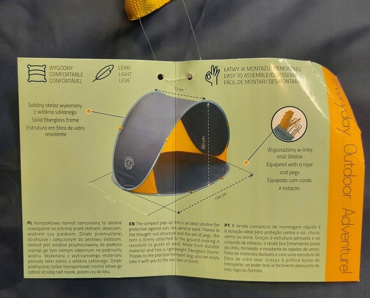 Компактная самонесущая палатка — идеальное решение для защиты от солнца, дождя, ветра или песка. Благодаря продуманной конструкции и входящим в комплект колышкам палатка прочно крепится к земле, что делает ее устойчивой к порывам ветра. Изготовлен из прочного материала, имеет легкий каркас из стекловолокна. Благодаря практичной сумке для транспортировки его легко можно взять с собой на море, озеро или в лес.