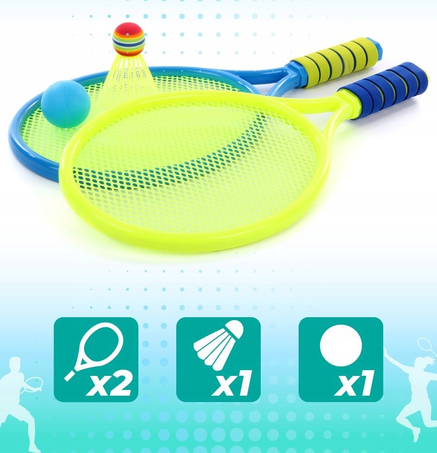 В состав входят: две красочные ракетки с гибкой сеткой и пенопластовой ручкой, пластиковый мяч и воланс пенопластовым наконечником.