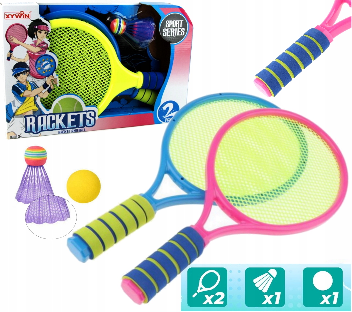 Состоит из двух красочных ракеток с гибкой сеткой и пенопластовой ручкой, пластикового мяча и волана с пенопластовым наконечником.