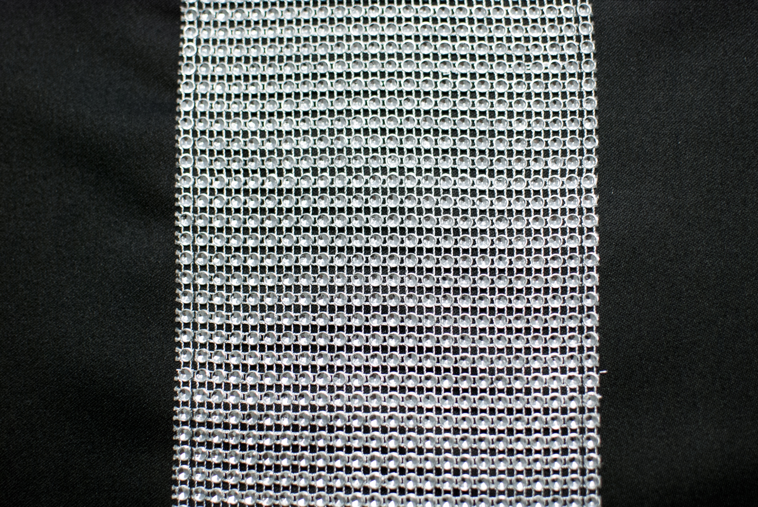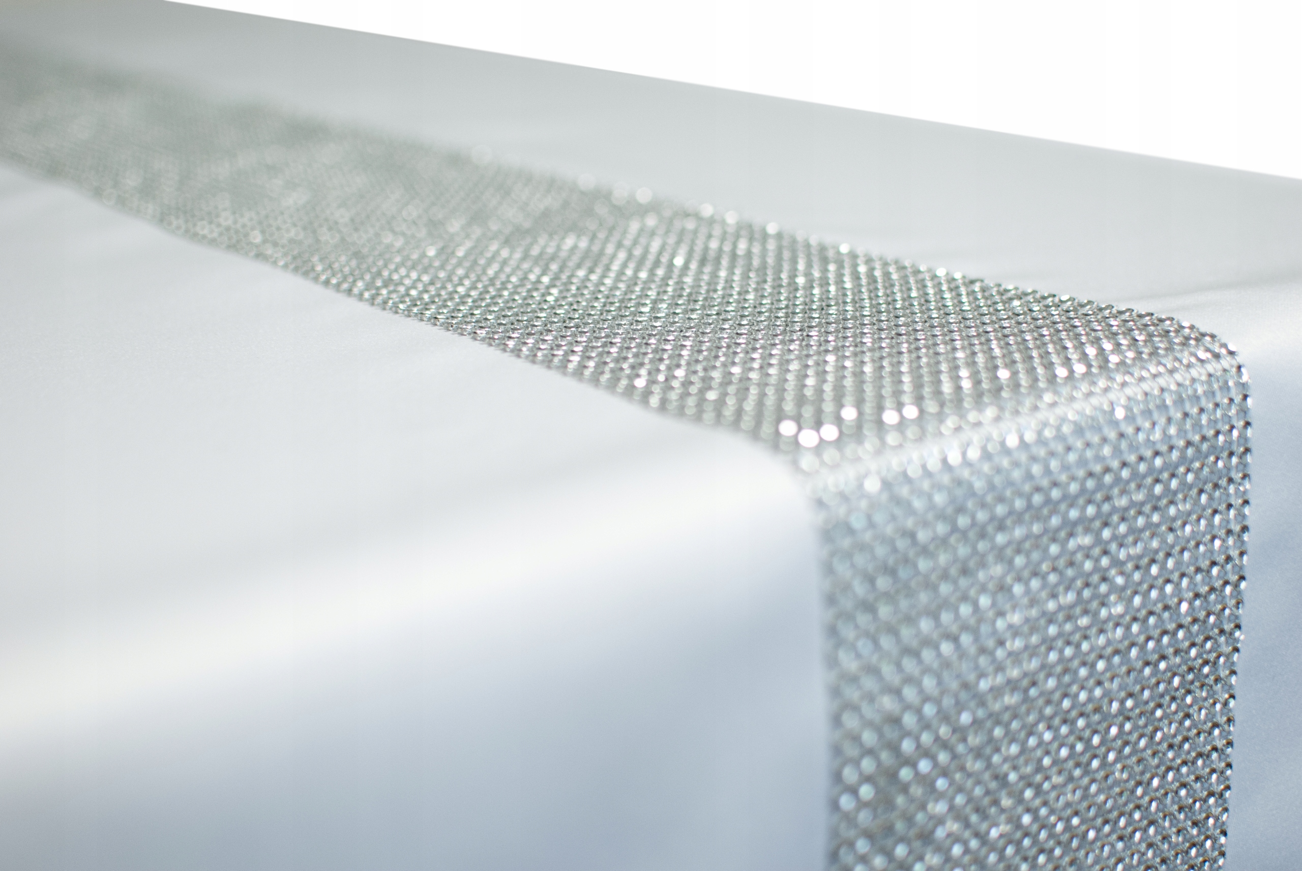 Толстая, из плотной, прочной ткани, равномерно устойчивая к пятнам настольная дорожка, отделанная на 1 см (подвернутой вверх) широкой, красиво переливающейся полоска цирконов, пришитая посередине.