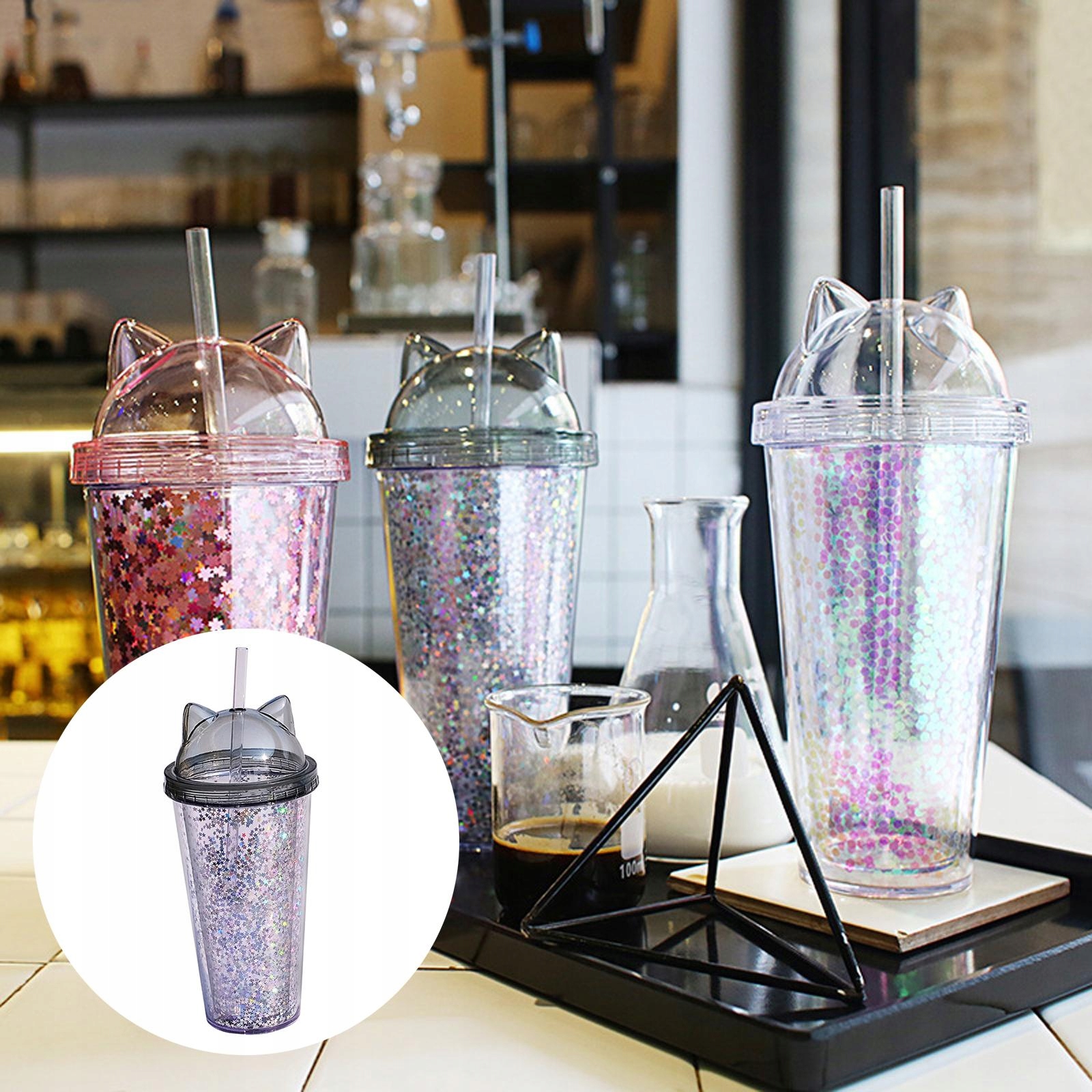 КРУЖКА С СОЛОМОЙ С ПАЙЕТКАМИ: Крышка чашки фигурной формы, корпус чашки инкрустирован блестками и снабжен трубочкой, выглядит очень стильно.