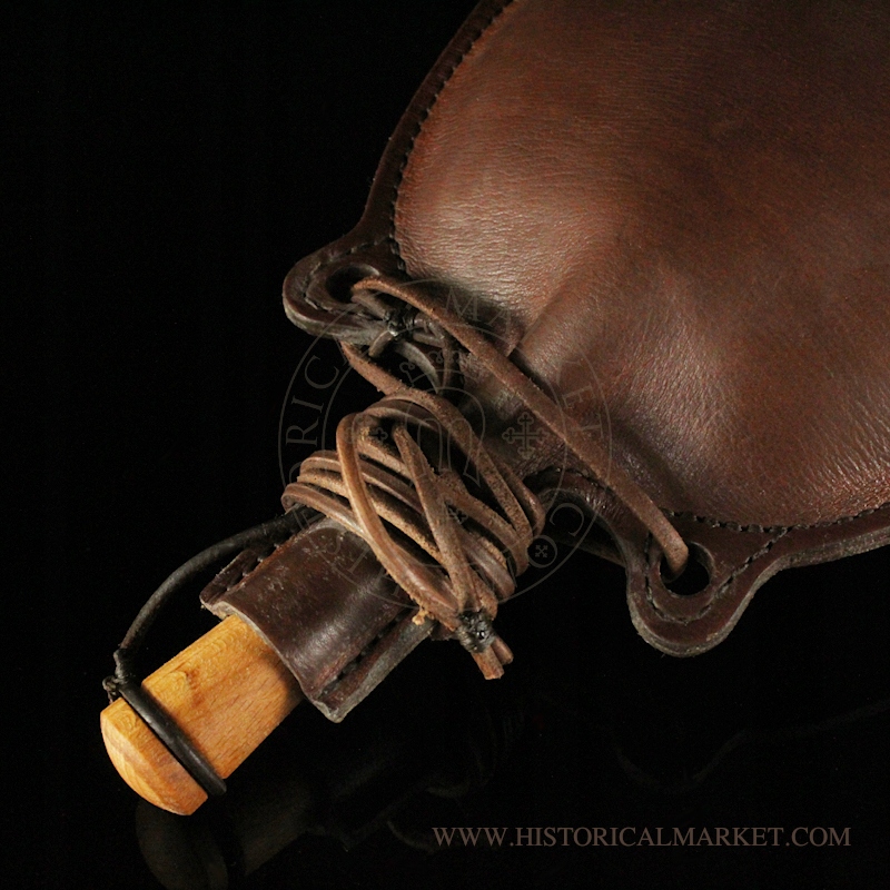 Кожаный флакон закрывается деревянной пробкой. Имеет ремень для подвешивания на плечо.