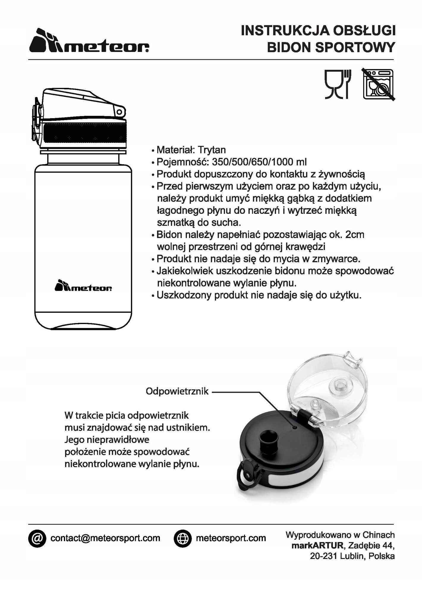 Оплачивая «Пляшка для води meteor 650 мл синій спортивний бідон тренування велосипед Meteor», вы можете быть уверены, что данный товар из каталога «Бутылки с водой» будет доставлен из Польши и проверен на целостность. В цене товара, указанной на сайте, учтена доставка из Польши. Внимание!!! Товары для Евросоюза, согласно законодательству стран Евросоюза, могут отличаться упаковкой или наполнением.
