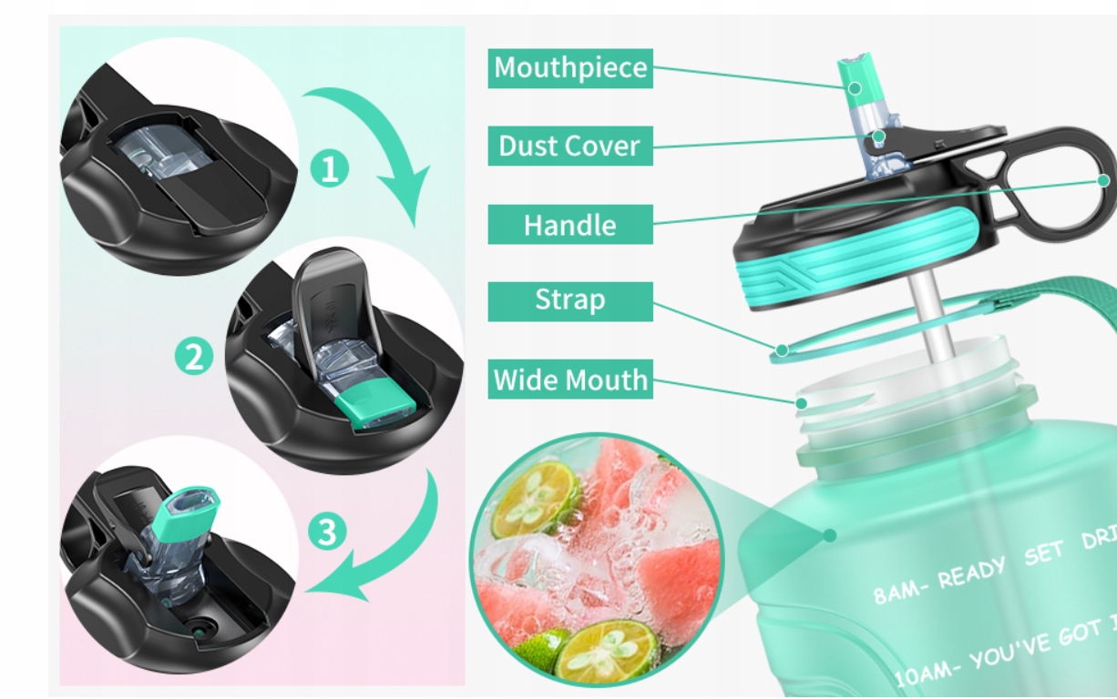 - Большая вместимость и дизайн с широким горлышком: емкость бутылки для воды составляет 74 унции (2200 мл), поэтому ее не нужно наполнять несколько раз. Бутылка для воды объемом 2,2 литра имеет достаточно широкое горлышко, в которое можно положить кубики льда или фрукты, такие как лимон, апельсин и другие, чтобы сделать вашу жизнь более здоровой.