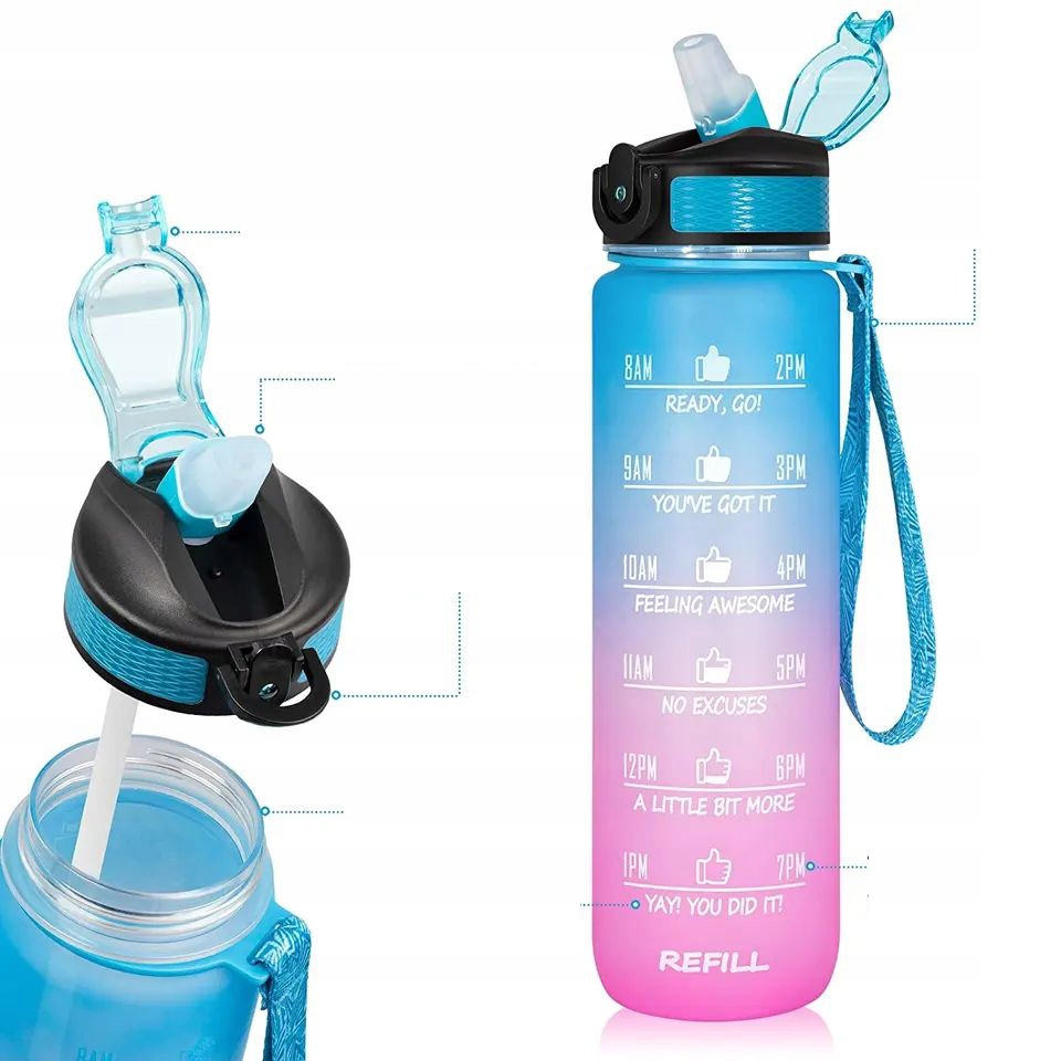 Безопасный материал, большая вместимость и мотивирующий мерный стаканчик. несомненные преимущества этой модной бутылки. Благодаря прикреплённому шнурку его легко переносить, а стационарно установленная соломинка позволяет быстро и легко пить в любых условиях.