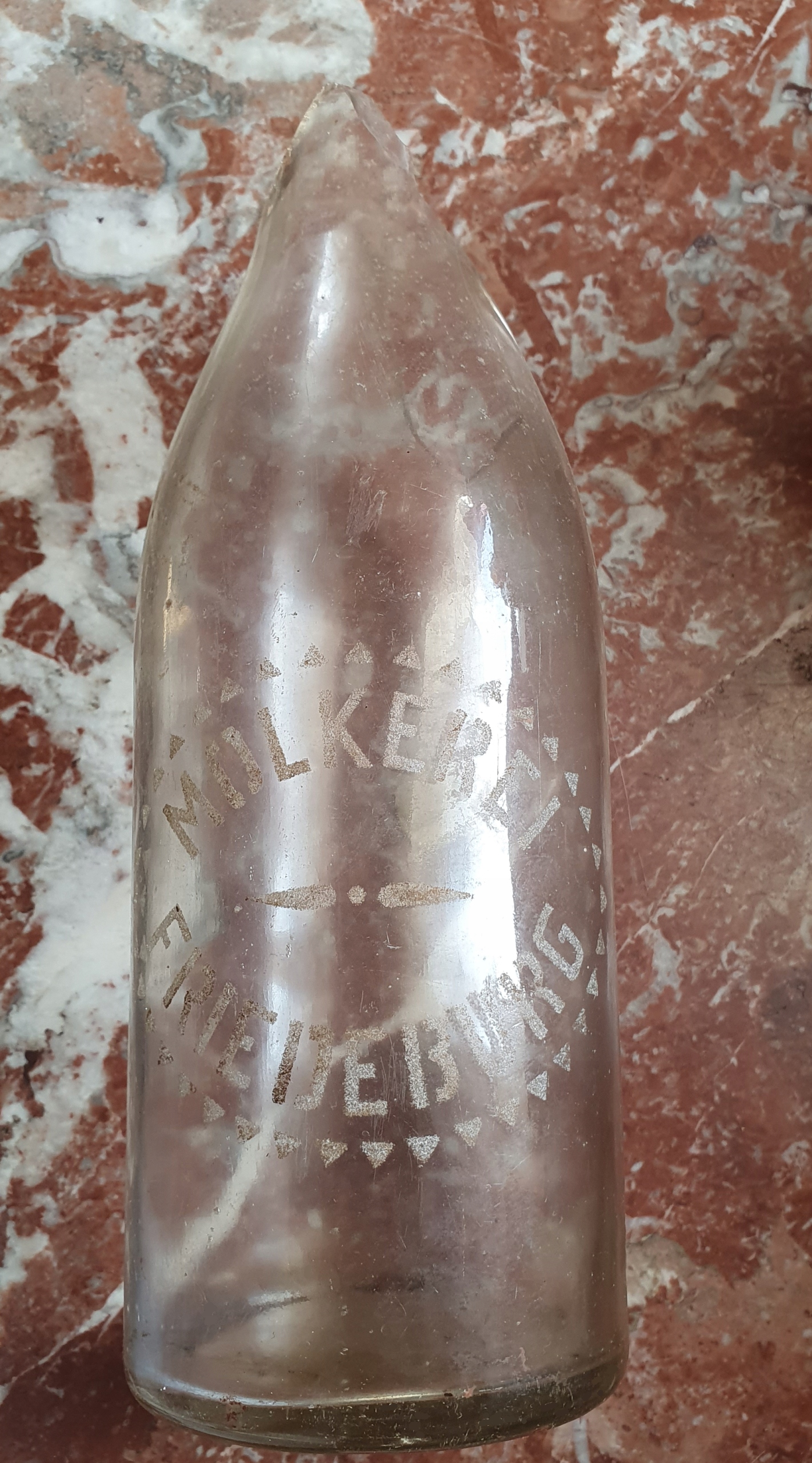 Предлагаю бутылку молока из города Фридебург, надпись - MOLKEREI - FRIDEBURG, надпись пескоструйная, верх бутылки отломан, и еще бутылку сливок или молока - Vollmilch, емкость. 250 мл. обивка по краю вверху, состояние бутылок точно такое же, как на фотографиях.