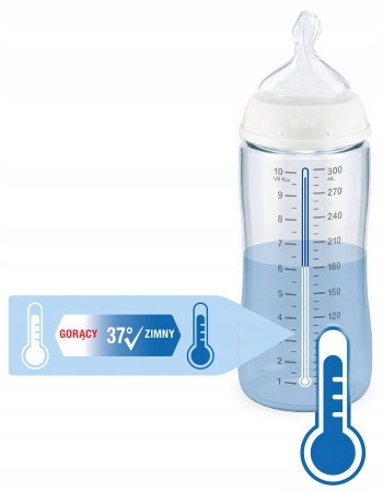 Чтобы еда не была слишком горячей, бутылочка NUK First Choice+ оснащена индикатором температуры Nuk. Индикатор имеет вид термометра и располагается между линиями шкалы. Индикатор меняет цвет при изменении температуры содержимого бутылки.