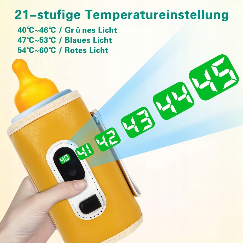 USB-подогреватель детского питания прост в использовании. Благодаря электронному дисплею он может отображать температуру нагрева в режиме реального времени. Нажмите и удерживайте кнопку питания, чтобы включить его, затем попеременно нажимайте кнопку питания, чтобы установить 21 уровень температуры: 40–60 °C, чтобы соответствовать различным температурным требованиям, подходящим для разных смесей сухого молока.